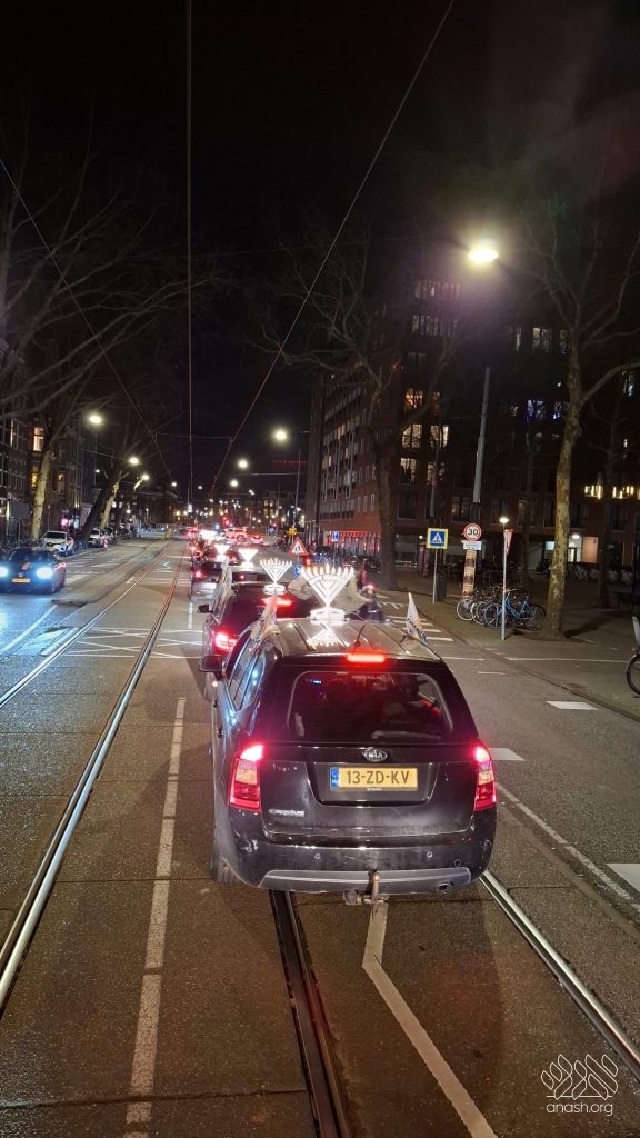 In the heart of Amsterdam, a vibrant menorah parade drove through the city’s center, featured a procession of 30 cars adorned with menorahs, accompanied by police escort and enthusiastic onlookers.