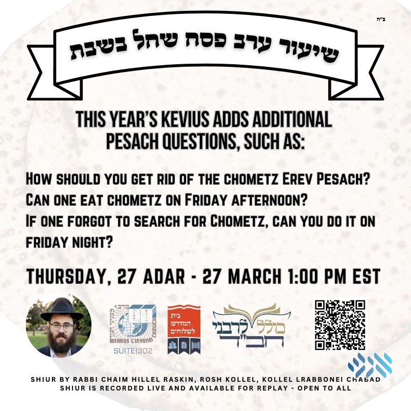 The Rosh Kollel of Kollel L’Rabbonei Chabad, HaRav Chaim Hillel Raskin will give a shiur going through the background and source material for this unique erev Pesach that falls on Shabbos. He concludes with practical halacha lmase guidance.