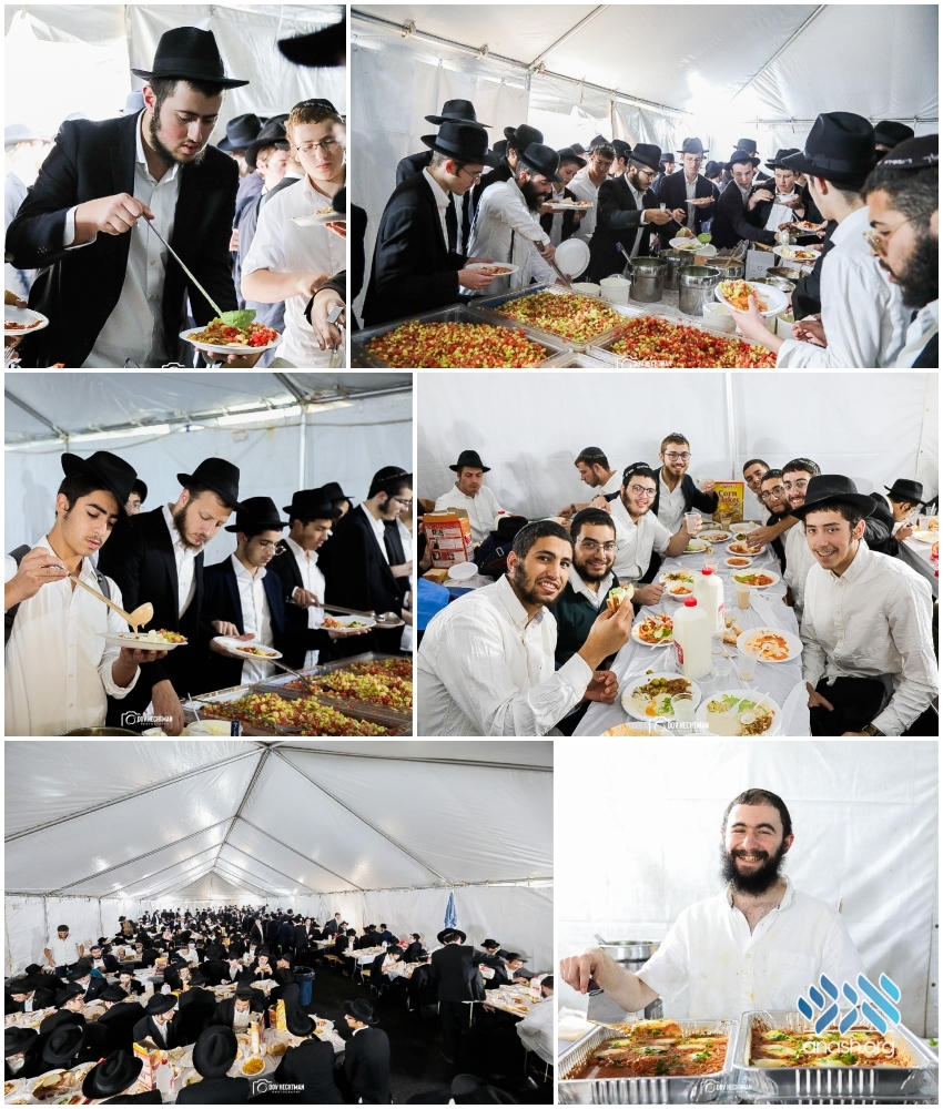 The bochurim being served in a tent that was set up on the parking lot of Oholei Torah, with the girls using one hall in the Eshel building, and families using the other.