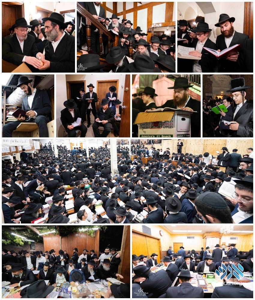 Thousands of anash and bochurim packed 770 to recite the entire Sefer Tehillim on Hoshana Rabba night filling every inch of 770, including the main Shul, upstairs zal, the Rebbe’s room, the Sukka, and the street outside.