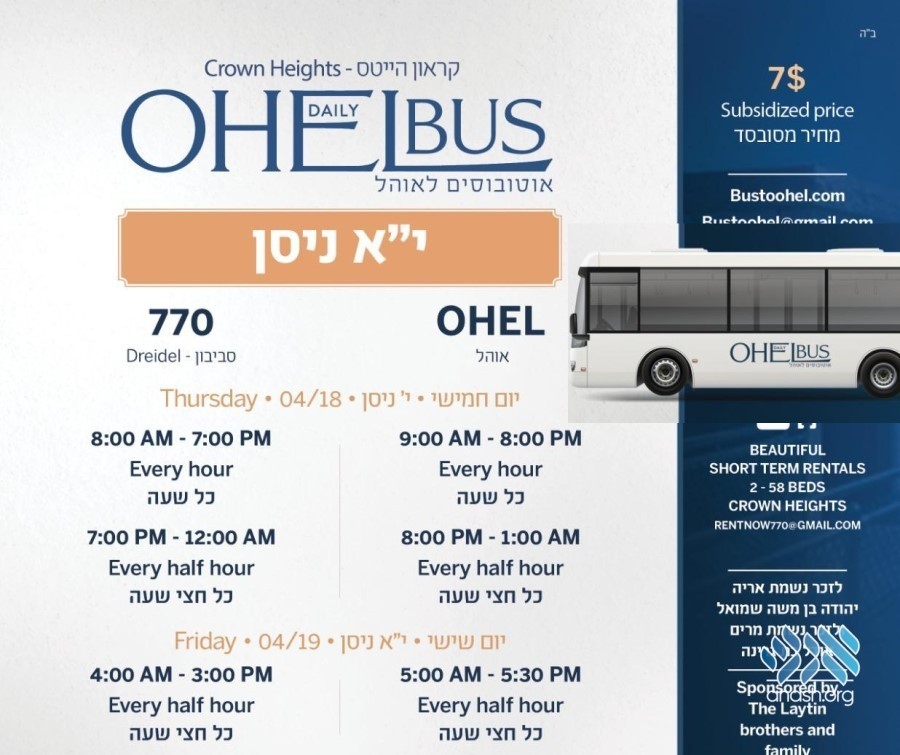 The Daily Ohel Bus announced expanded hours and added trips to the Rebbe’s Ohel in the days leading up to, and following, Yud Alef Nissan. Details inside.