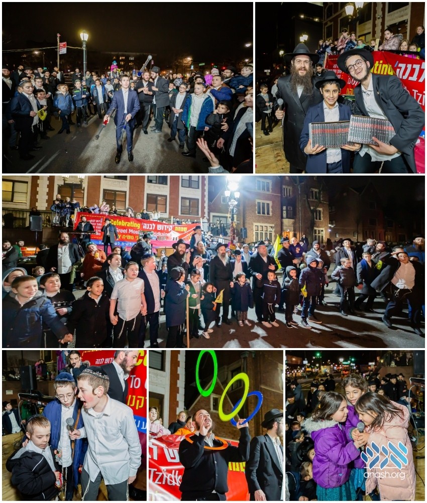 Crown Heights families gathered outside 770 for a special Hakhel kiddush levana and joyous dancing accompanied by live music, a fire and juggling show, and raffles for children.