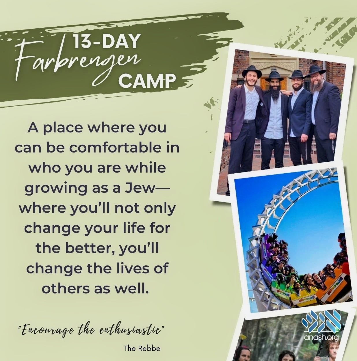 See, the objective of the 13-Day Farbrengen Camp is to amplify and set in motion a series of events to return not one, not two but at least six holy Jews to a place of divine inspiration. One that will not only change their lives for the better but will also have them changing the lives of others as well.