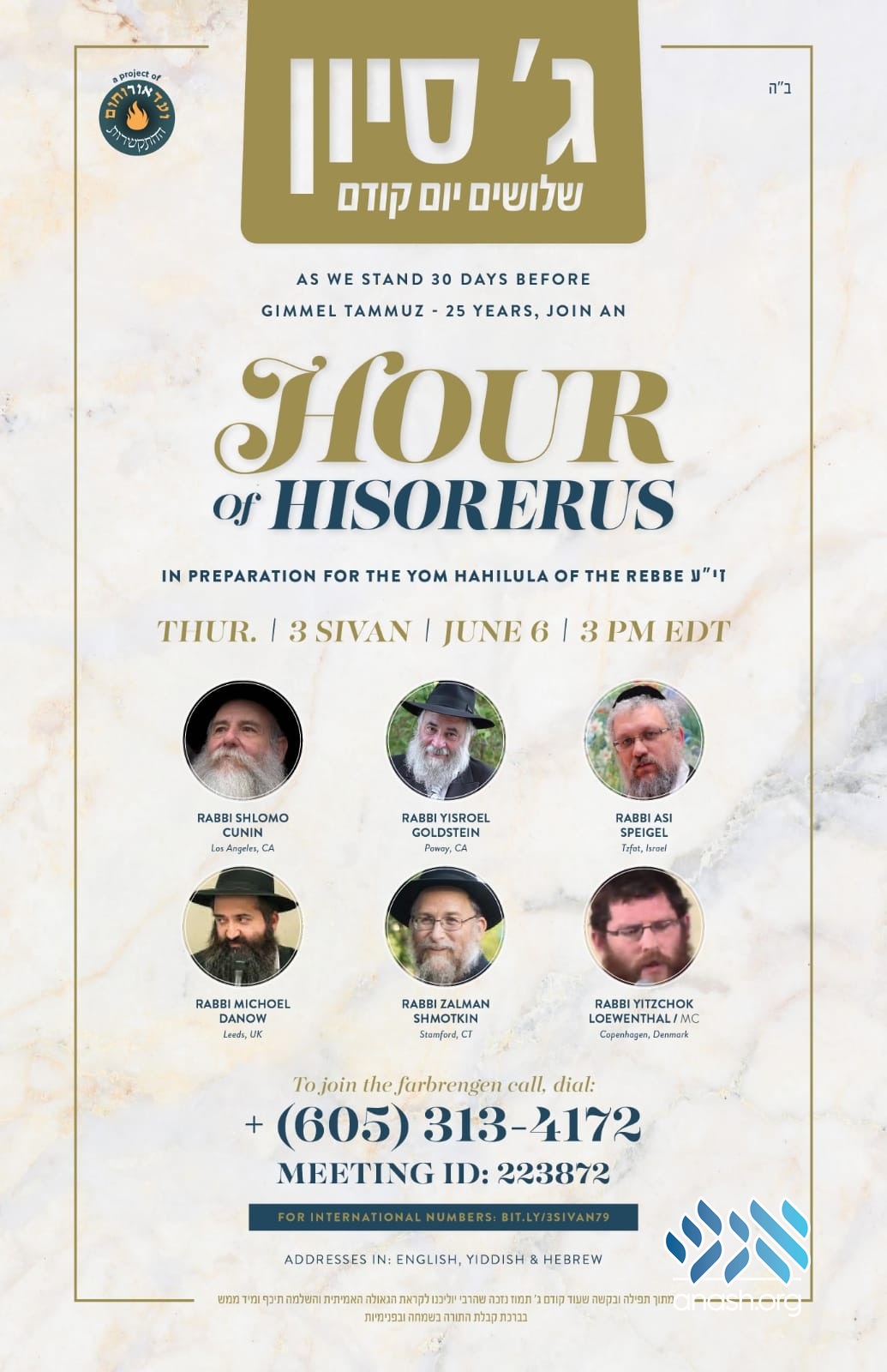 In preparation for Gimmel Tammuz, a dial-in farbrengen will be held Thursday afternoon.