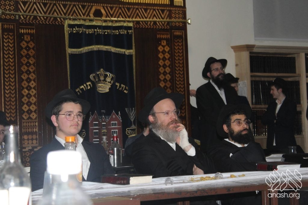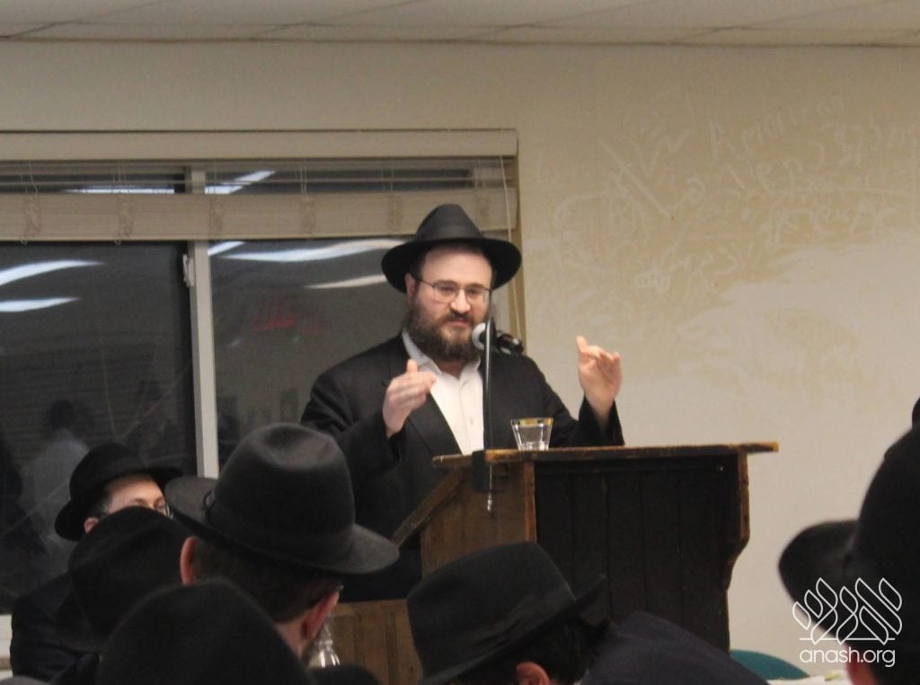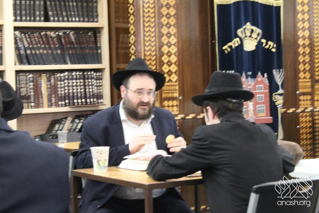 During the course of the seudah, divrei Torah and Hisorerus were shared by hatmimim Shmaryahu Bronstein (PA), as well as shluchim Rabbi Zalman Raskin (PA), Rabbi Shmuel Turk (CH), and Rabbi Mordechai Groner (Calgary). The Seudah was followed by Farbrengens all night with Rabbi Sender Geinsinsky (Maryland) and Rabbi Dovid Abba Mockin (Rochester).