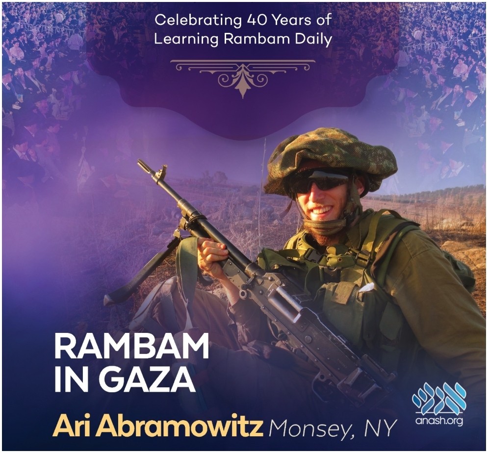 The upcoming Siyum HaRambam celebration, scheduled for this Wednesday, Erev Yud Alef Nissan, on Eastern Parkway, will include a special feature titled “Rambam in Gaza.” The video highlights the experiences of Ari Abramowitz, an IDF soldier who studied Rambam while serving in Gaza.