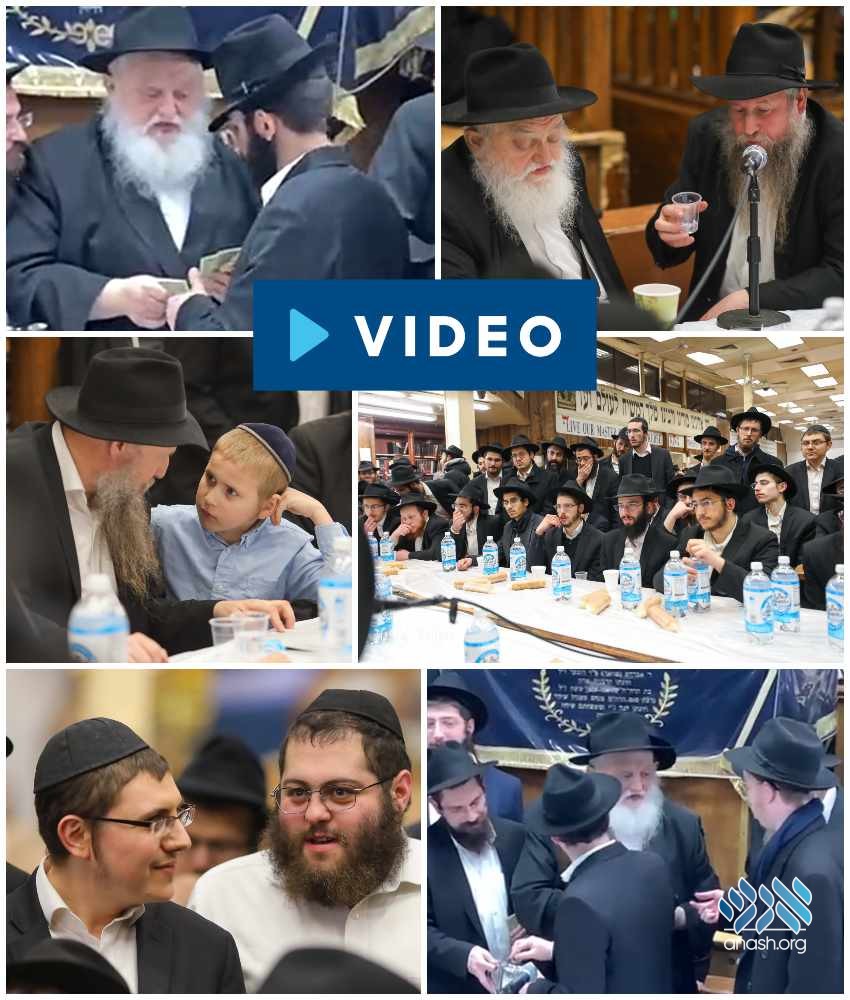 At the conclusion of the farbrengen, Rabbi Shlomo Zarchi and Rabbi Kuti Feldman distributed Chanuka gelt to all the Bochurim studying in central Tomchei Temimim 770, as was the Rebbe’s directive to members of Hanhala.