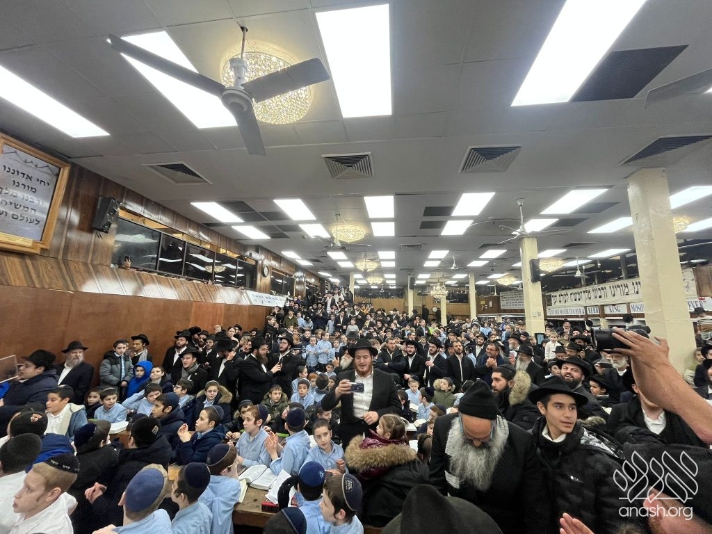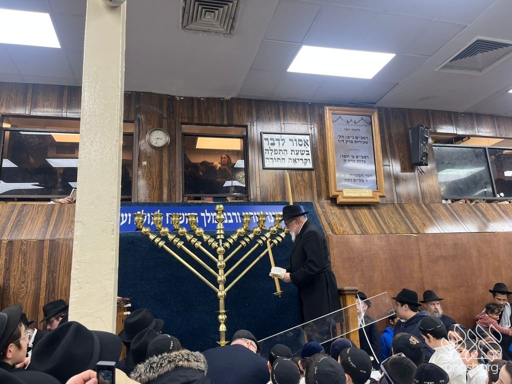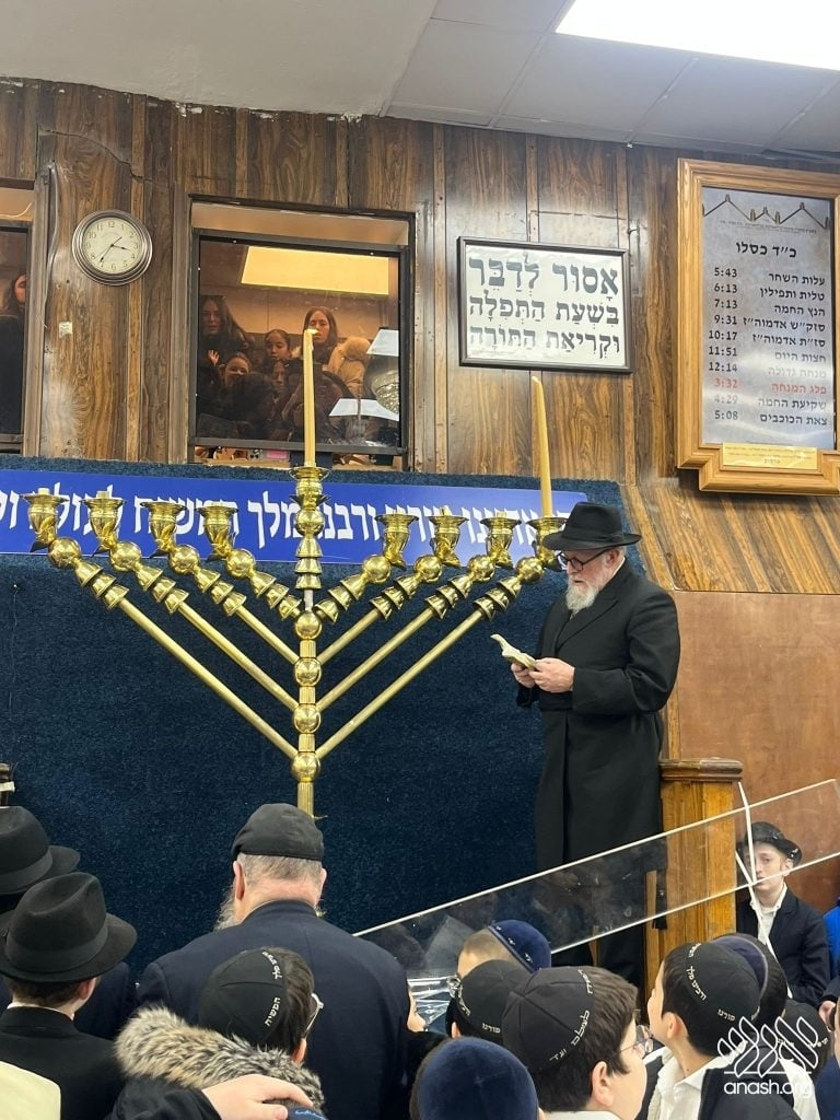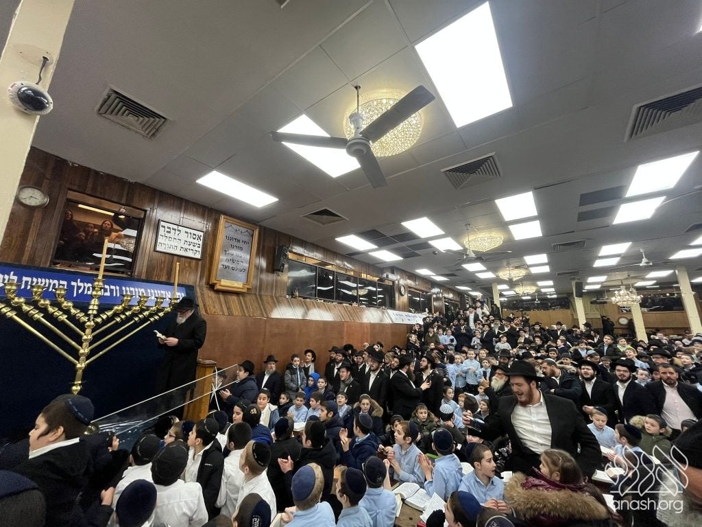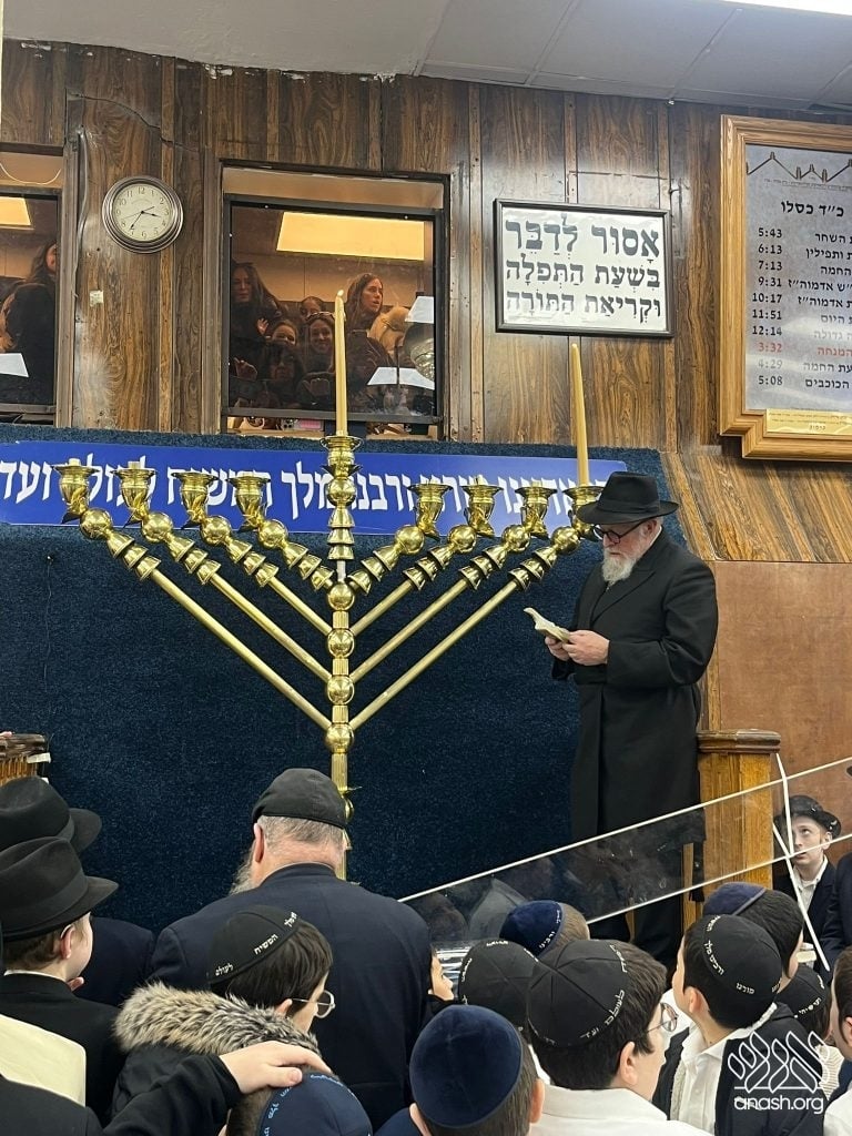A large crowd gathered in 770 for the lighting of the first Chanukah light of 5786, followed by a rousing rendition of Haneiros Halalu.