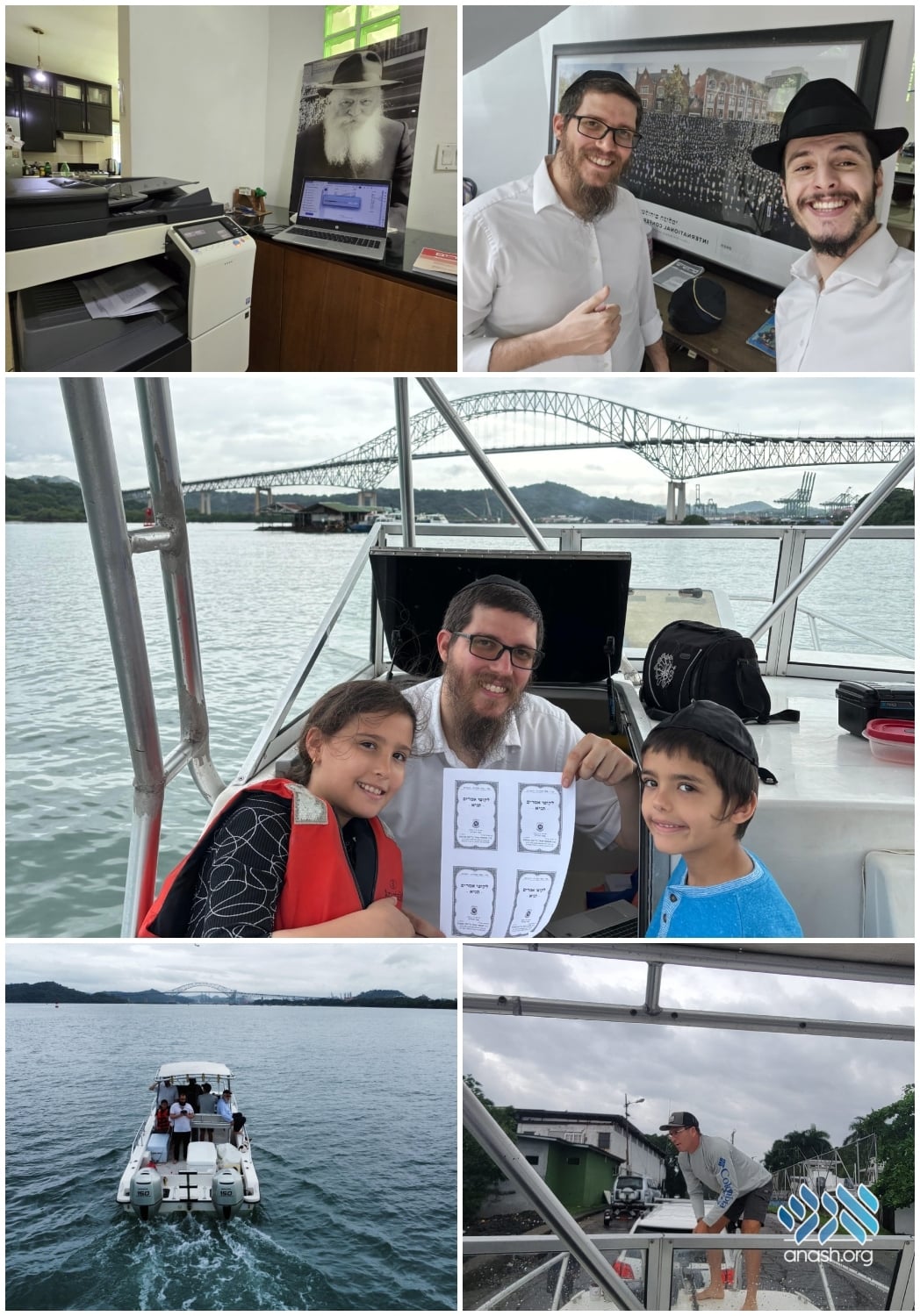 As the boat glided through the waters of the Canal, a portable printer powered by a generator brought fresh Tanya pages to life. The first full print of 4 copies were done in the boat, followed by the rest of the Tanya´s being printed in the Chabad House in the Canal Zone with the help of the bochur Moshe Wolfsohn.