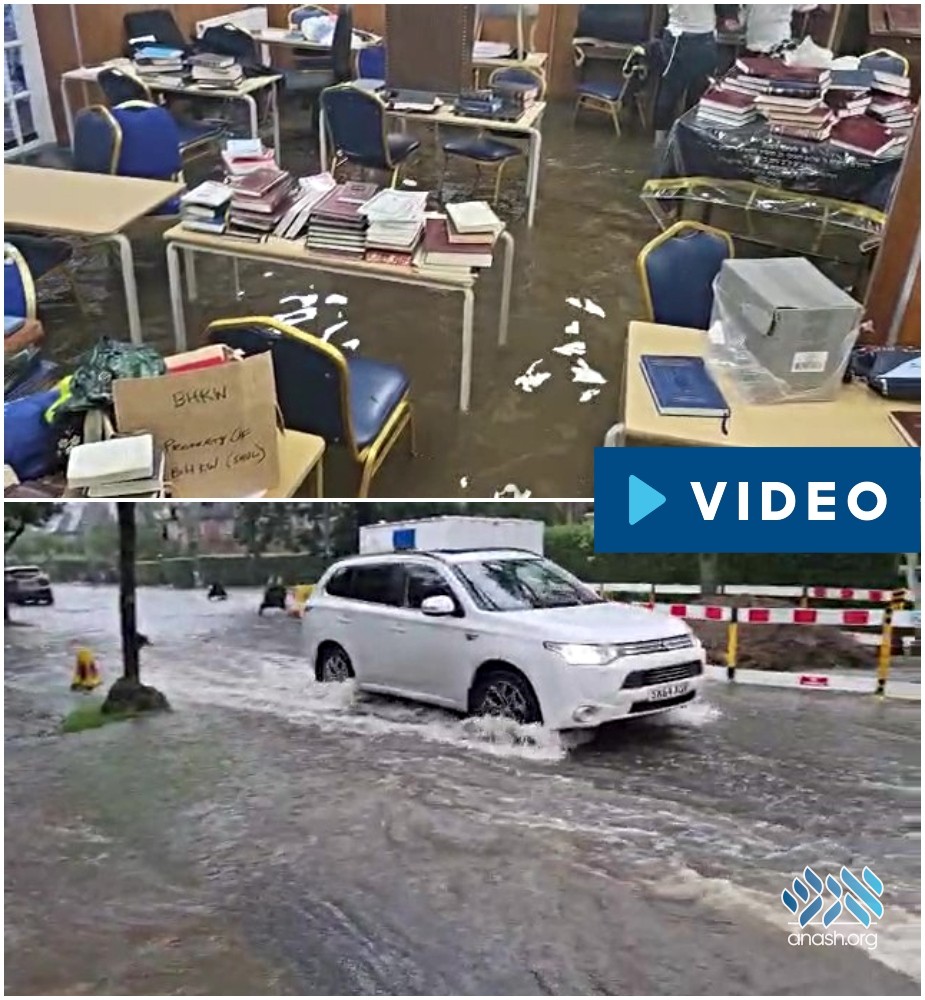 Heavy rain hit London on Monday afternoon, causing flash floods across the city, and forcing the Chabad Yeshiva to evacuate their building which had flooded with nearly two feet of water.