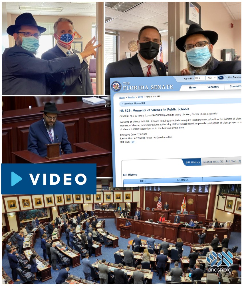 The passing of the bill was the result of years of effort by a group of Florida shluchim, including Rabbi Yosef Junik, Rabbi Yossi Denburg, Rabbi Schneur Z. Oirechman and Rabbi Yossi Hecht. They were helped by Rabbi Avrohom Frank, who has advocated for a Moment of Silence across the nation for decades.