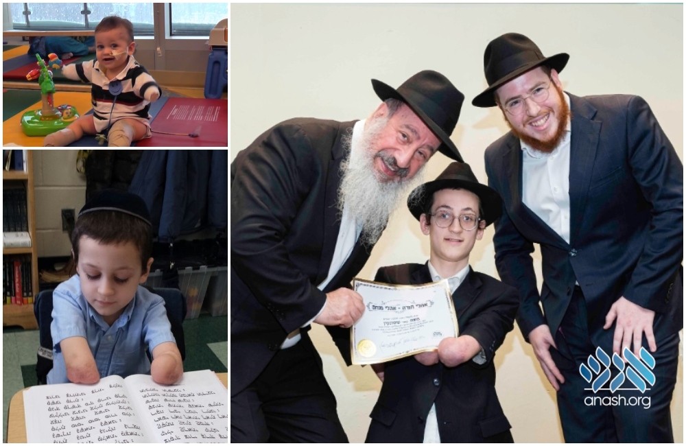 Moshe Sasonkin was born a beautiful healthy baby boy. When he was just seven months old he contracted a rare infection that resulted in multiple amputations of his hands and feet. Despite the many challenges he faced on the daily, Moshe grew to be a successful, happy, and very regular Oholei Torah boy. Today, he graduated eighth grade with his class, as his parents and the whole community proudly cheered him on.