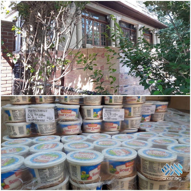 Huge quantity of assembled produce boxes and essential food items, such as Orange Juice, Gefilte Fish, Wraps and Challah Rolls, available outside F.R.E.E. 1383 President Street.