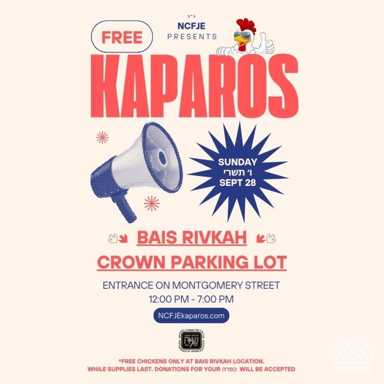Free chickens for kaparos will be distributed this Sunday, 6 Tishrei, September 28 from 12:00 PM to 6:00 PM at the parking lot of Beis Rivkah Crown St. This offering is exclusively available to residents of Crown Heights, East Flatbush and Remsen Village, and only at the Beis Rivkah location. The chickens will be provided at no cost, and donations for kaparos per one’s individual means will be graciously accepted and appreciated.