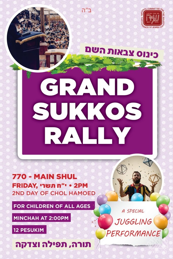 A grand Sukkos rally for children will be held on Friday in the main shul of 770, with 12 pesukim, music and a fire juggler.