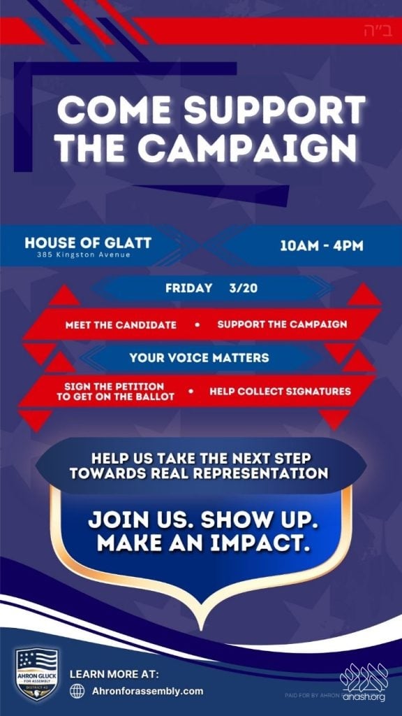 Come support the Assembly campaign for Ahron Gluck, in front of House of Glatt on Kingston Avenue and Crown Street in Crown Heights, Friday between 10am and 4pm.
