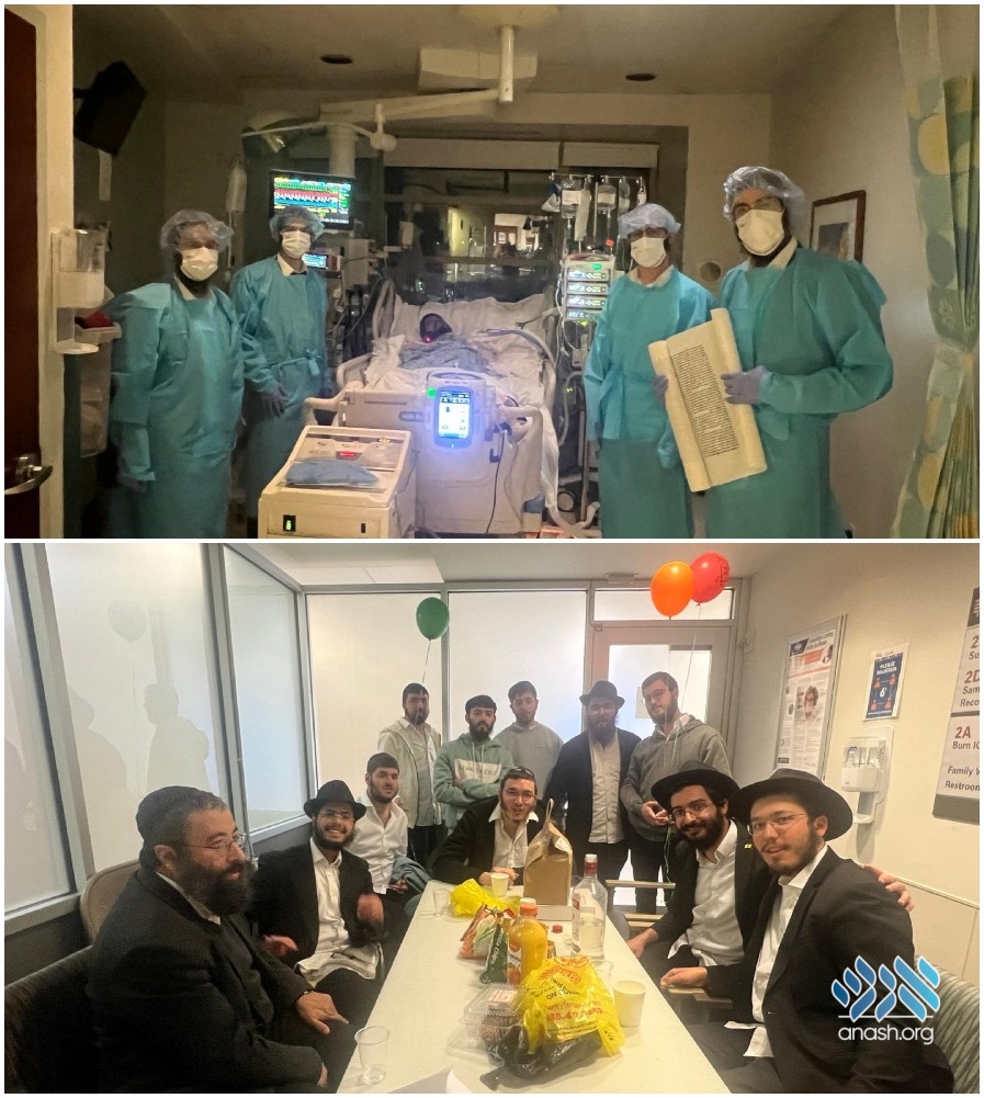 Over Purim, friends of Shmulik Amar, the critical victim of the fire in a bochurim residence in Crown Heights, went to visit him in the ICU and read Megilah for him. A farbrengen was also held in the hospital in honor of Shmulik’s birthday with his father, who has been by his bedside since he was hospitalized.