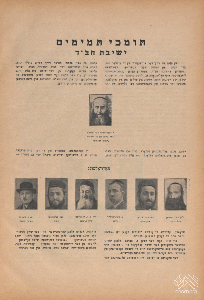 Afterward, speeches about the inyanei deyoma were given by the rosh mesivta and menahel of the yeshivah, the distinguished bochur Dov Yitzchak Schneersohn, and the mashpia of Chabad Chasidus in the yeshivah, Harav Zalman Meir Gutman.