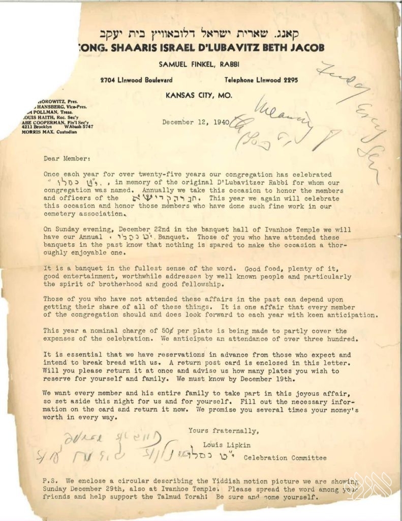 Not too far away from Sioux City, “Congregation Shaaris Israel D’Lubavitz Beth Jacob” of Kansas City also celebrated Yud-Tes Kislev every year. The letter sent by Louis Lipkin on behalf of the Yud-Tes Kislev Celebration Committee in 5701 indicates that they didn’t really know what they were celebrating, and no traces of chasidus are identifiable in the program. But they still celebrated the day, and interestingly enough, still preserved the old custom of honoring the Chevra Kadisha.