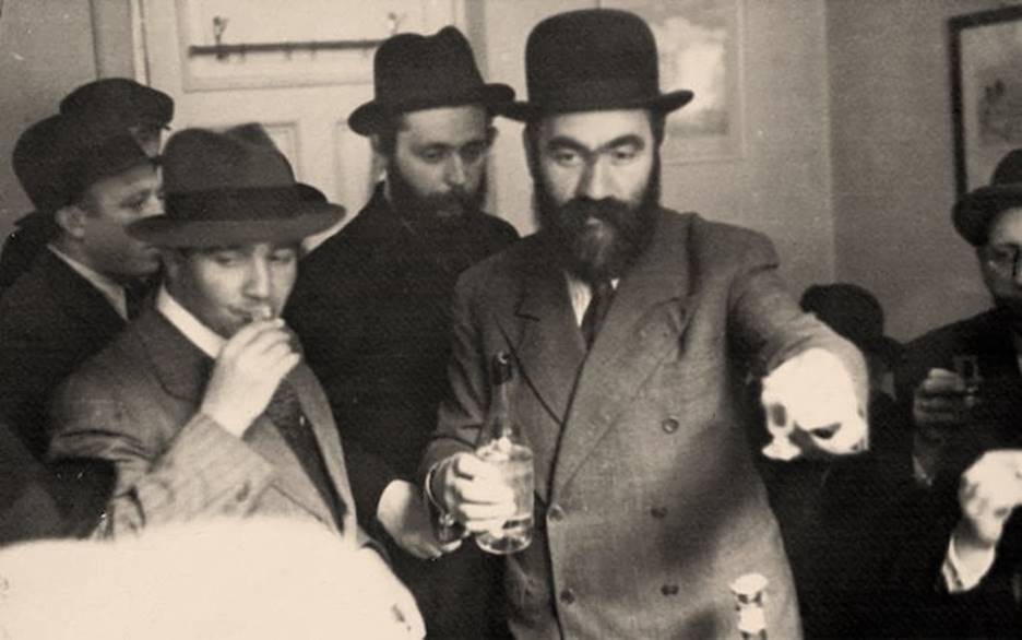 Everyone must drink today. To refuse even a little mashkeh is considered a grave offense. The role of the sar hamashkim was taken that evening by the Riga shochet, R. Mordechai Cheifetz, who holds a few bottles of all kinds of mashkeh and ensures the crowd is drinking properly.