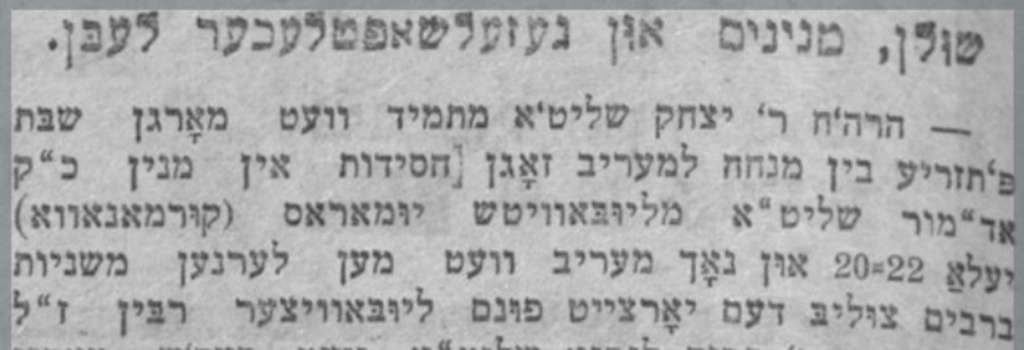 Surprisingly, the writer of this article understood R. Itche’s unique personality quite well and did a good job conveying it to the readers. The Frierdiker Rebbe’s mazkir, R. Chatche Feigin, was so impressed by the article that he wrote to R. Yisrael Jacobson in America that he should try to get this article reprinted in the American Jewish press. Preparations were underway at this time for R. Itche to embark on what became a two-year visit to America, so R. Chatche was eager to introduce R. Itche to the American public (Yiras Hashem Otzro, p. 164).