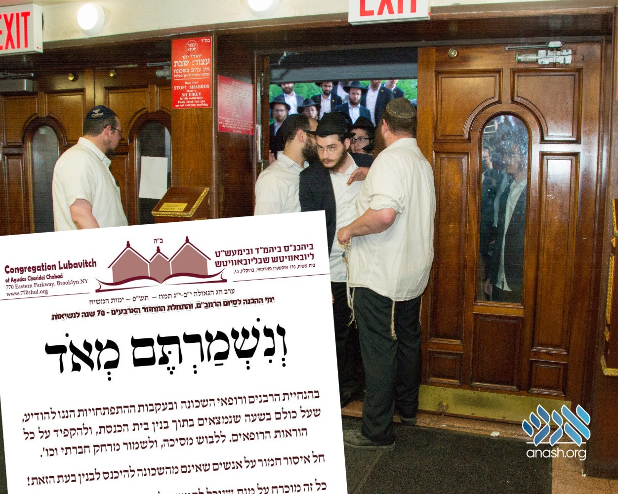 As Crown Heights moves to ‘yellow light’ mode, and in light of the letter released by the Crown Heights Beis Din on Thursday, the gabboim of 770 have set guidelines for the shul, including forbidding any guests from entering the building.