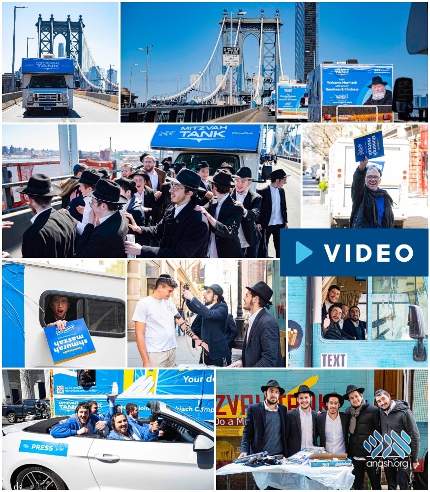 The parade then continued to Grand Army Plaza and through the streets of Brooklyn, before dividing up and crossing all three bridges into Manhattan. Once there, the tanks split up to 73 locations where bochurim and children distributed thousands of shmurah matzahs, put tefillin on with hundreds of men, and spread the message of Rebbe’s message to countless Jews and non-Jews.