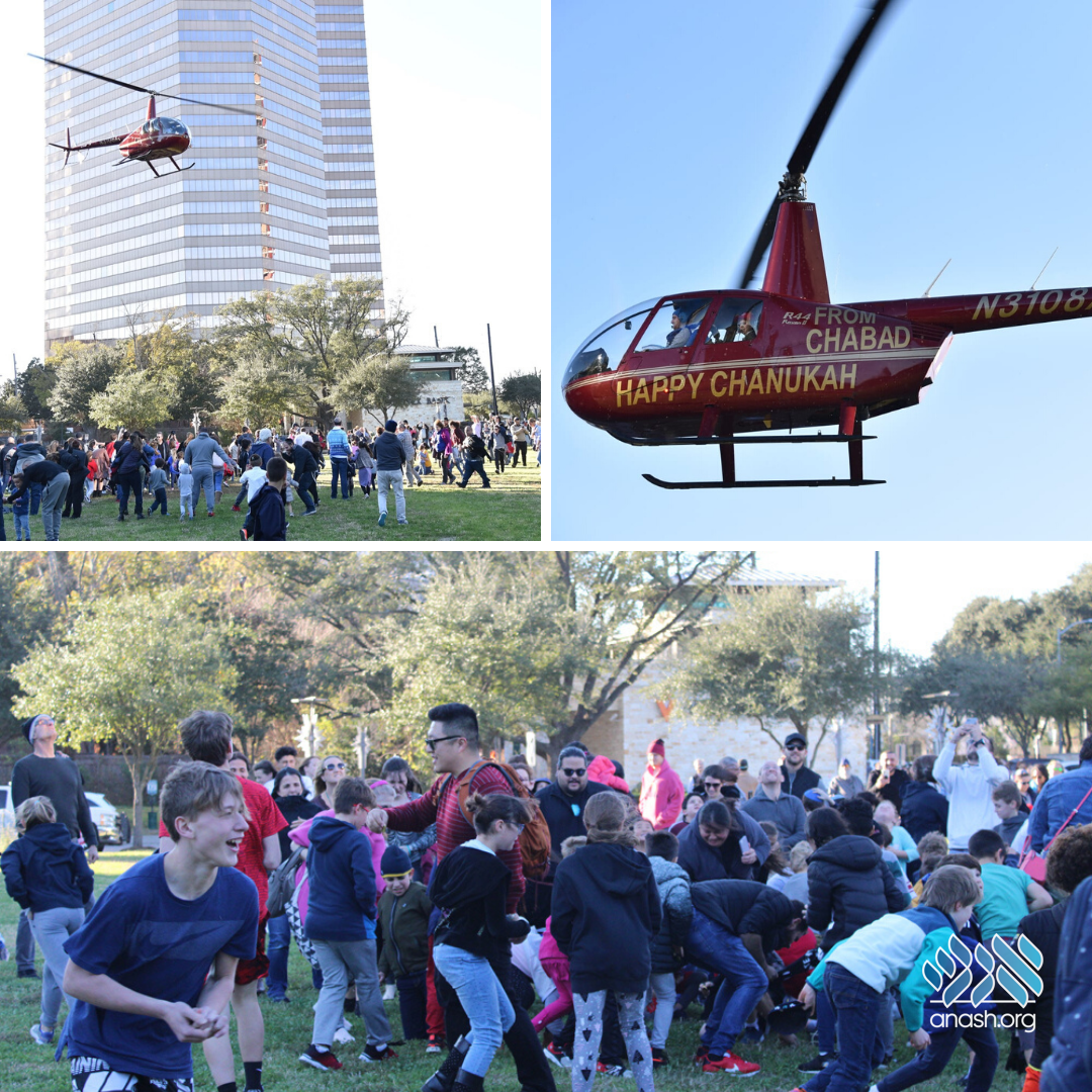 A hovering helicopter dropped 1,500 pieces of chocolate gelt sending hundreds of kids – and adults – running around to gather the chocolate.