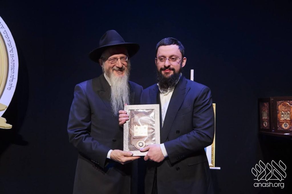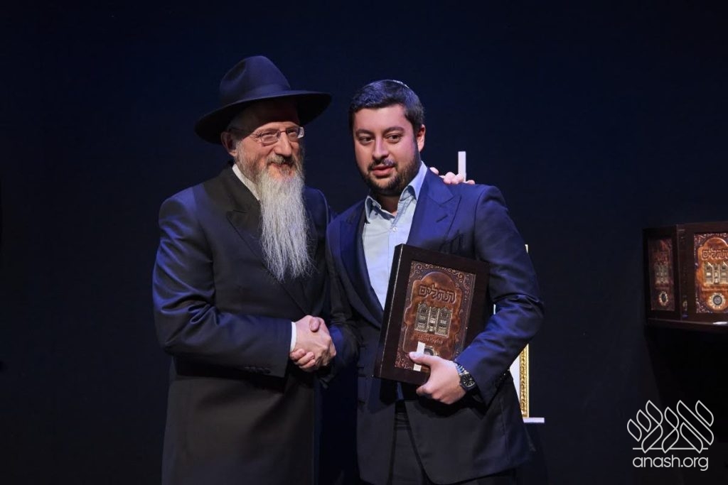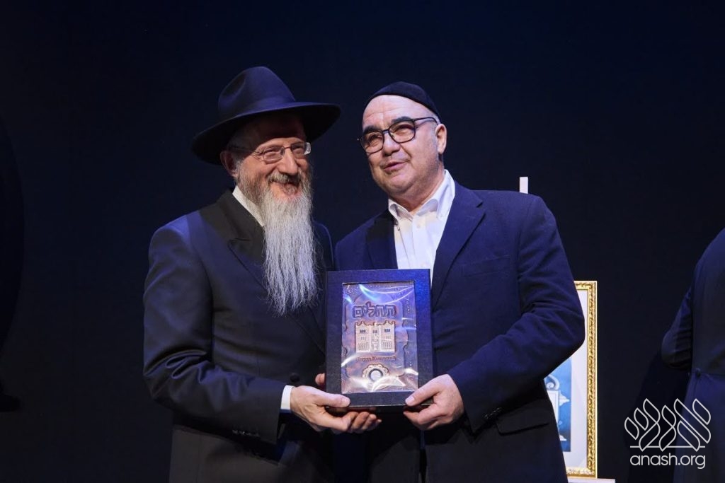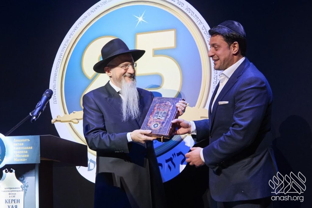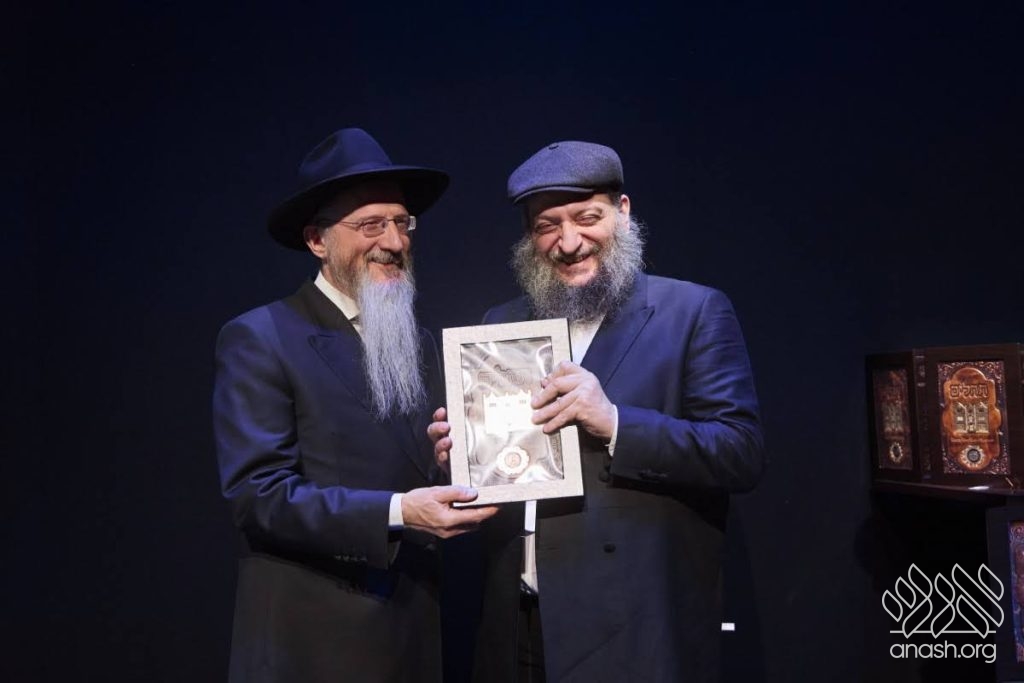 Special tributes of appreciation were presented to the President of the Federation of Jewish Communities of Russia, Rabbi Alexander Boroda; to the founder and chairman of the “770 Russia” Fund, Rabbi Yehuda Davidov; and to the president of the STMEGI Foundation, Mr. German Zakharyayev. The Chief Rabbi presented each of them with a copy of the holy Tanya and a coin with a blessing from the holy hands of the Lubavitcher Rebbe, artistically incorporated into breathtaking displays. All who saw the tributes expressed their admiration at the unique beauty of these gifts, as well as the other presents distributed later in the evening to the supporters and friends.