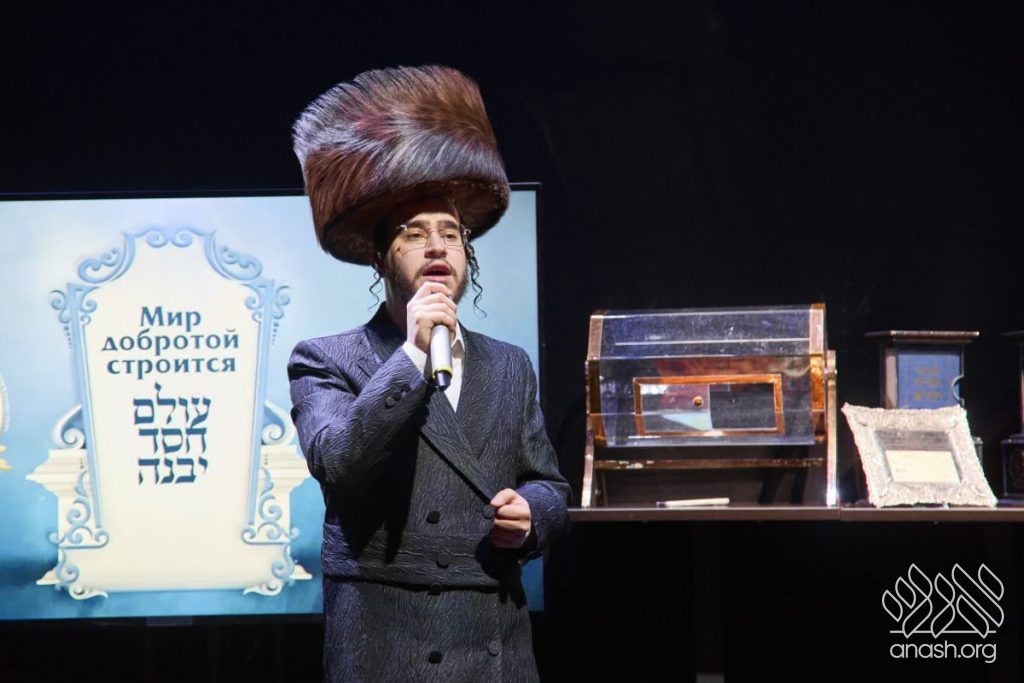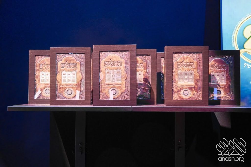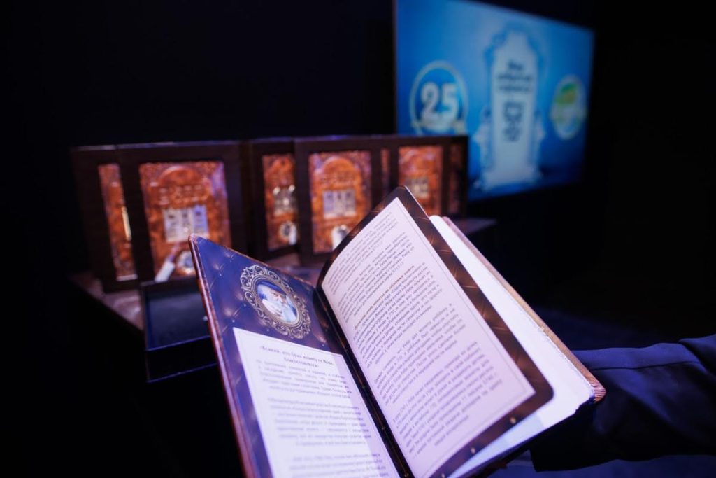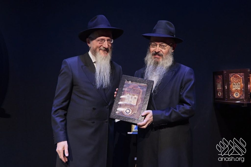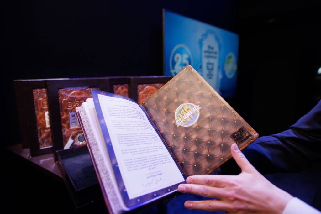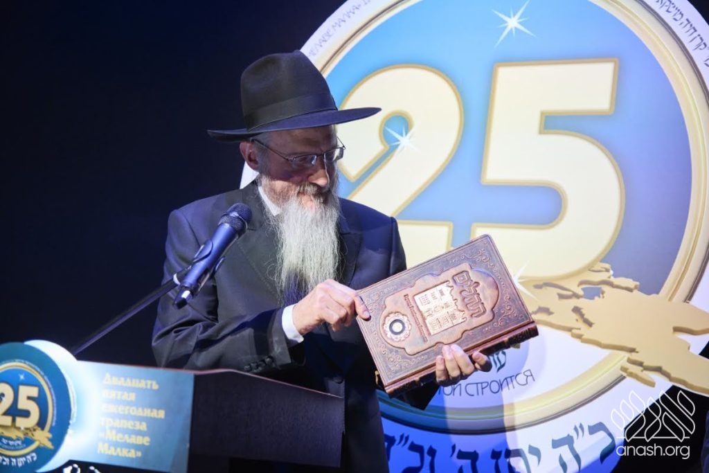 Special tributes of appreciation were presented to the President of the Federation of Jewish Communities of Russia, Rabbi Alexander Boroda; to the founder and chairman of the “770 Russia” Fund, Rabbi Yehuda Davidov; and to the president of the STMEGI Foundation, Mr. German Zakharyayev. The Chief Rabbi presented each of them with a copy of the holy Tanya and a coin with a blessing from the holy hands of the Lubavitcher Rebbe, artistically incorporated into breathtaking displays. All who saw the tributes expressed their admiration at the unique beauty of these gifts, as well as the other presents distributed later in the evening to the supporters and friends.