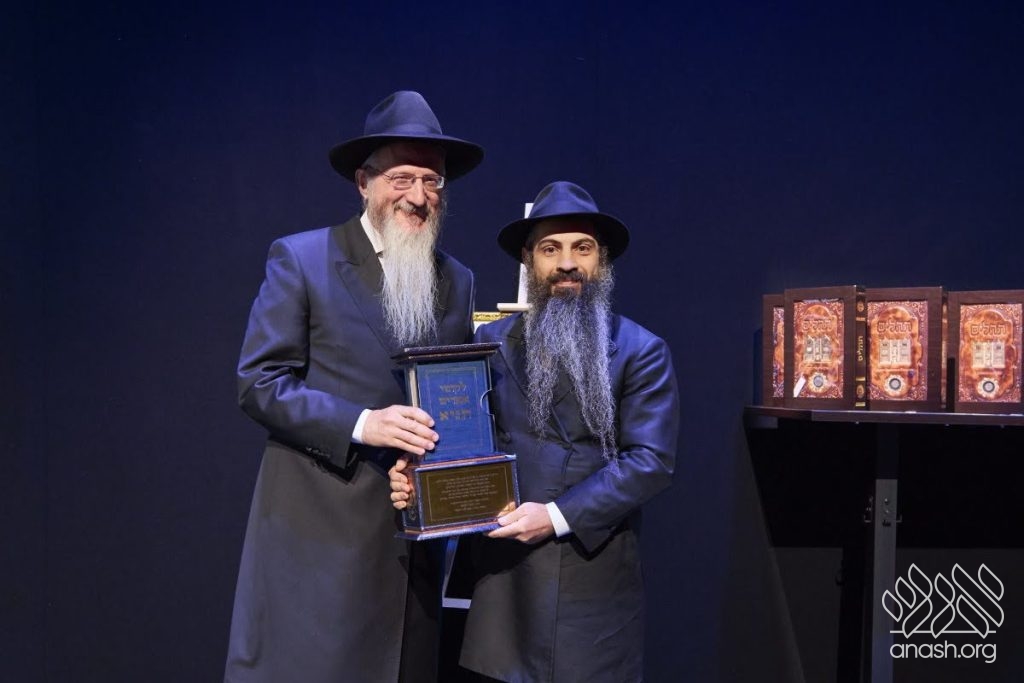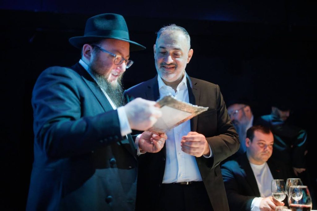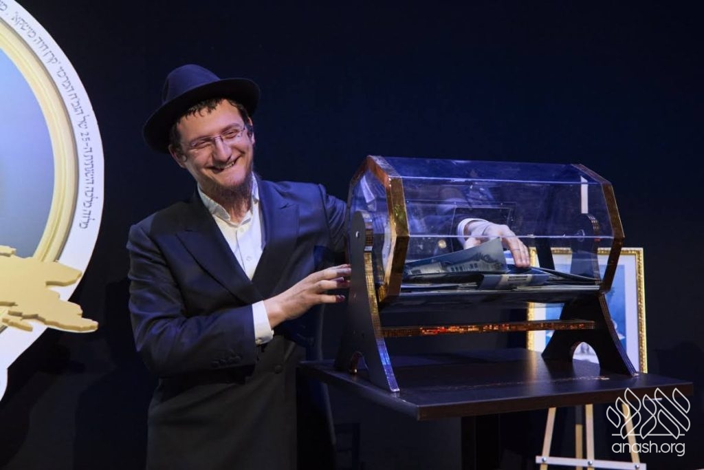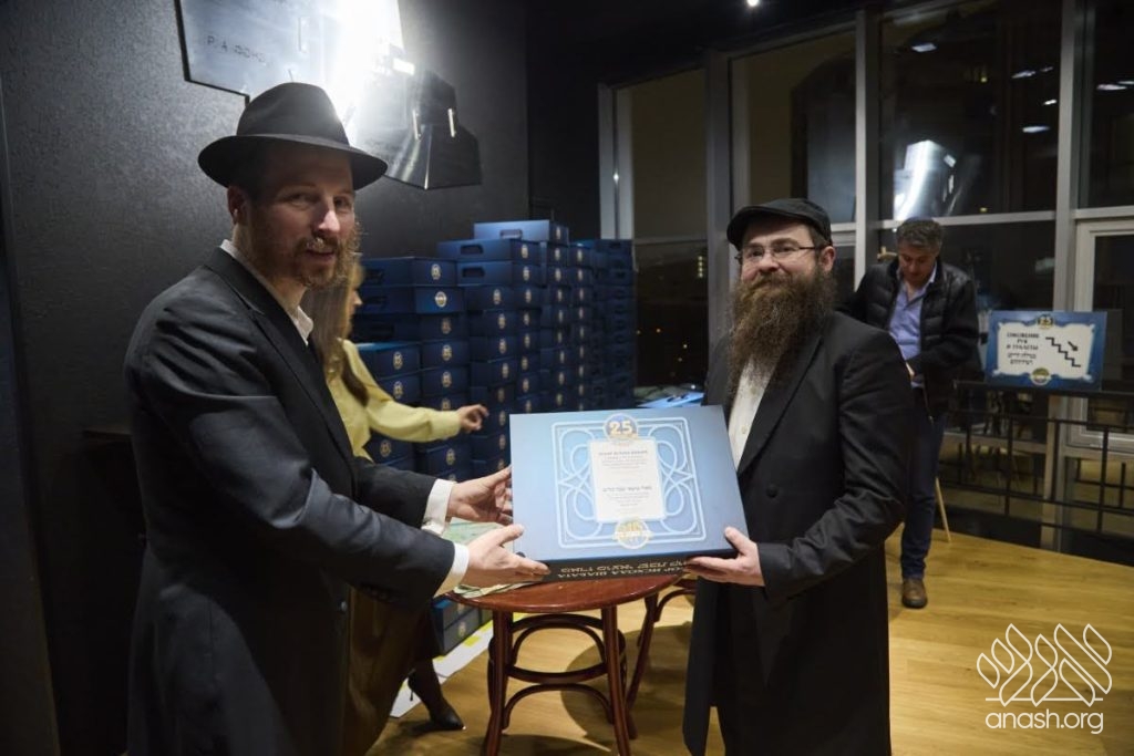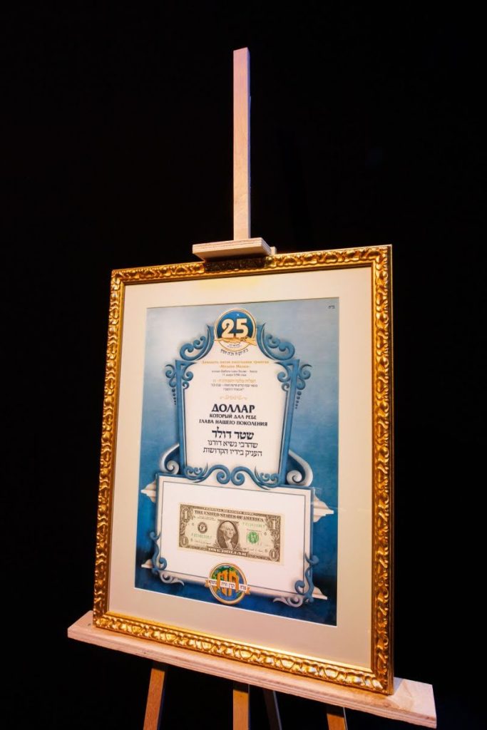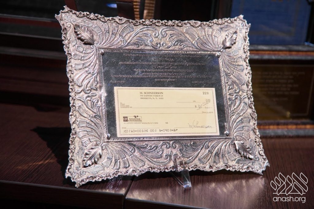 This year’s grand seudah was generously sponsored by the President of the Federation of Jewish Communities of the CIS, philanthropist R’ Lev Leviev, one of the earliest supporters of the gemach fund. Representing him was his son-in-law, R’ Dovid Halevi Eliezerov, who received on his behalf a unique and rare gift from the gemach administration — a cheque bearing the holy signature of the Lubavitcher Rebbe zy”a for the sum of twice chai dollars.