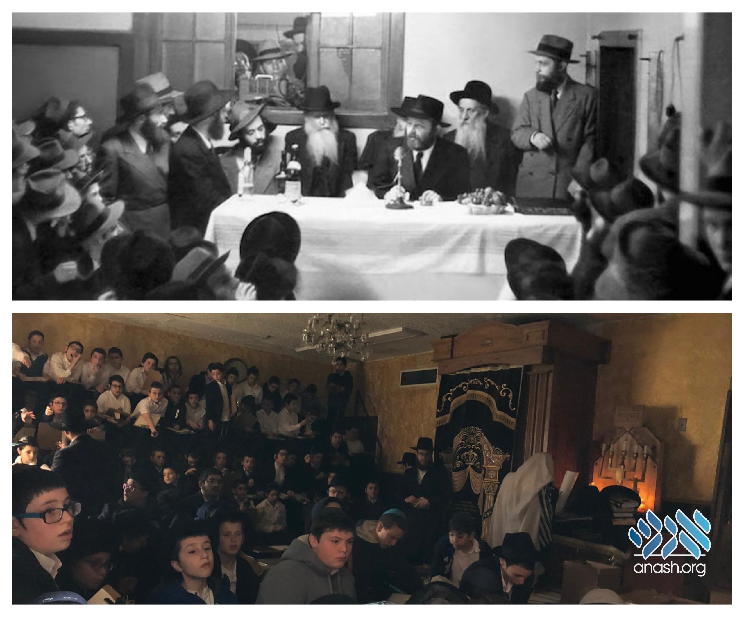 70 years ago, the Rebbe held his first official farbrengen in 770, during which he delivered the maamar Basi Legani and took upon the nesius. Seven decades later, over 1000 Crown Heights schoolchildren came to the same spot to watch and listen to that very farbrengen.
