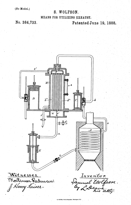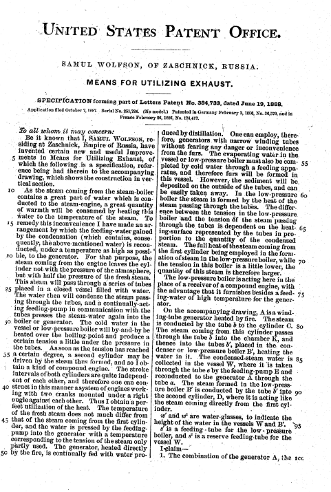 An 1898 filing by “Samul Wolfson of Zaschnick, Russia” for a U.S. patent for “means for utilizing exhaust,” including a drawing and a letter of explanation in English