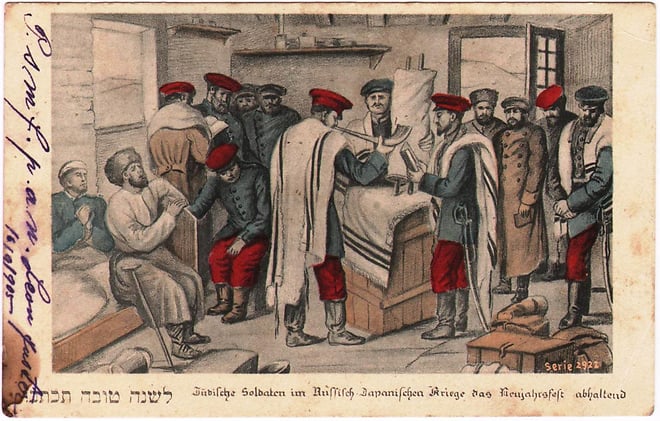 A Russian postcard from 1905 depicting “Jewish Soldiers in the Russo-Japanese War Preparing for the New Year”