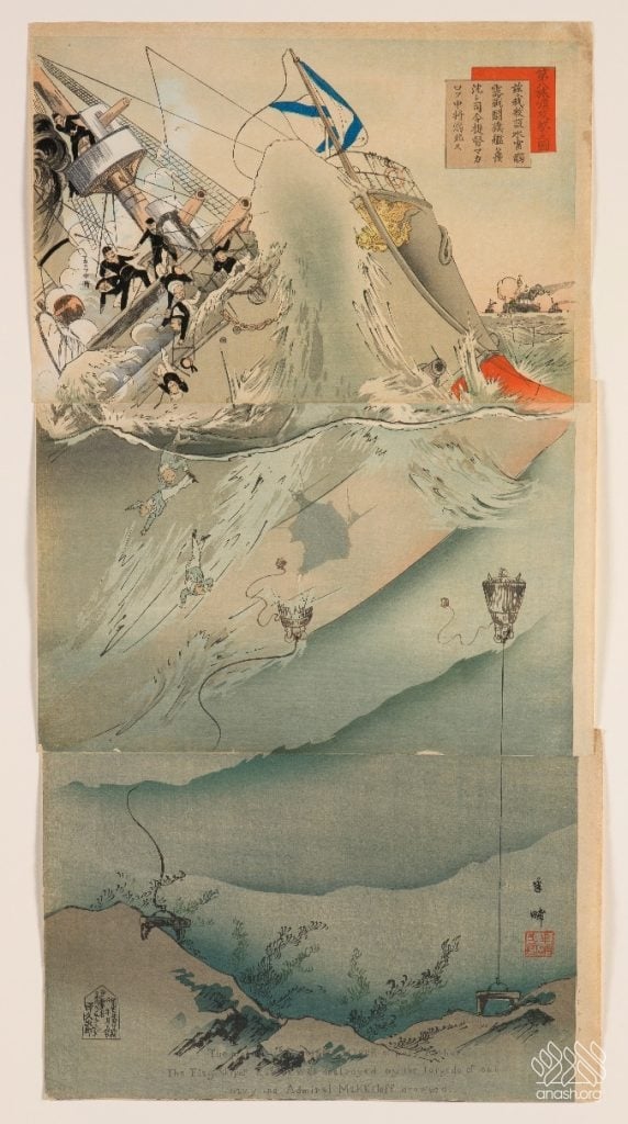 A Japanese depiction of the sinking of Petropavlovsk. The caption reads: “The Eighth Attack on Port Arthur: The Flagship of Russia Struck our Buoyant Mine and Sank Instantly, and Vice Admiral Makarov Drowned.”