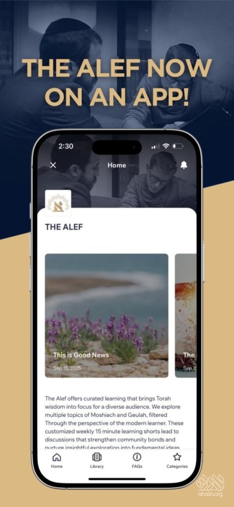 More than 60 topics are available, covering a wide range of Moshiach and Geulah themes. The library is complete and accessible on demand at TheAlef.co, with an option to subscribe to a weekly email highlighting timely selections. The series is also available through The Alef app on Google Play and the App Store.
