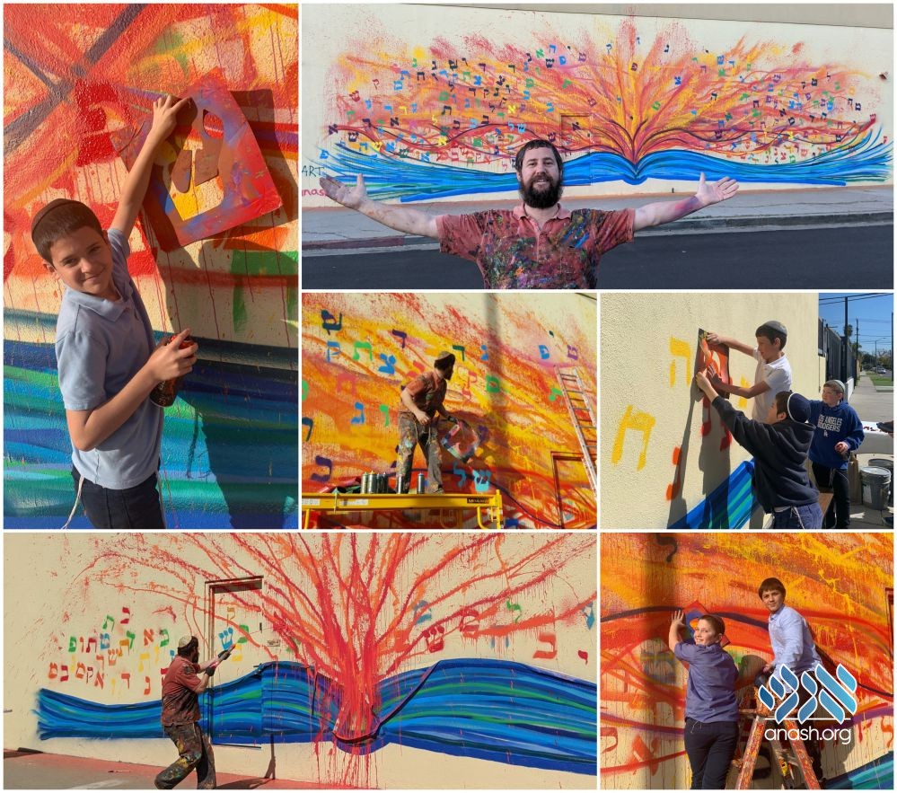 Artists Yitzchok Moully and Sheina Dorn got together with the students of Cheder Menachem Los Angeles to create an artistic wall. The result: a seventy foot wide mivtzoim mural right on La Cienega Blvd.