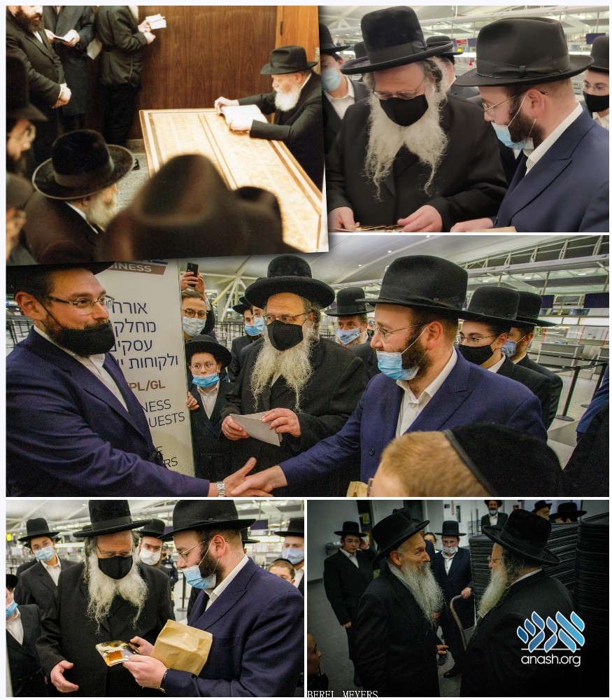 While leaving back to Eretz Yisroel escorted by hundreds of Chassidim, the Gerrer Rosh Yeshiva Harav Shaul Alter was greeted by two Lubavitcher bochurim who presented him with historic pictures of his father, the previous Gerrer Rebbe, meeting the Rebbe.
