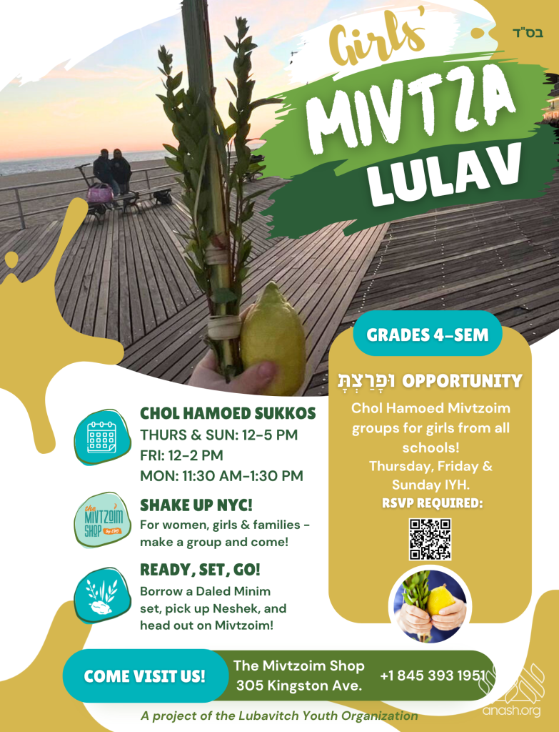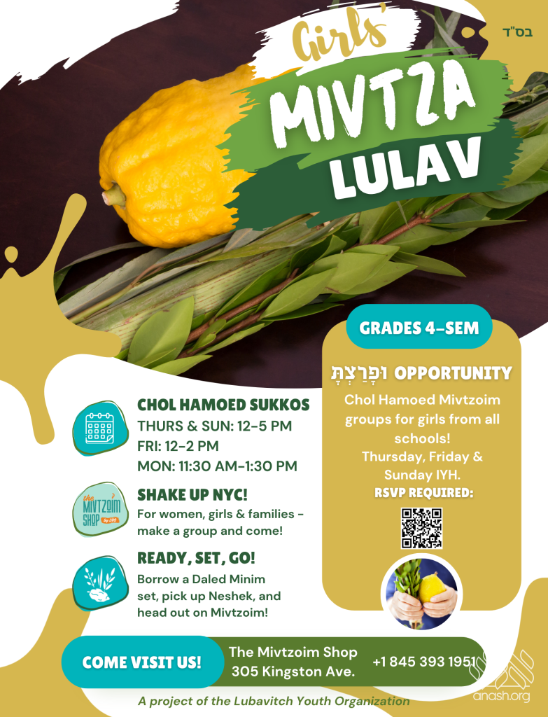 Conveniently located on Kingston Avenue, the Girls’ Mivtza Lulav Center for women and girls will be open for those who wish to pick up pre-made Mivtzoim Arba Minim Sets to borrow and take with them on mivtzoim.
