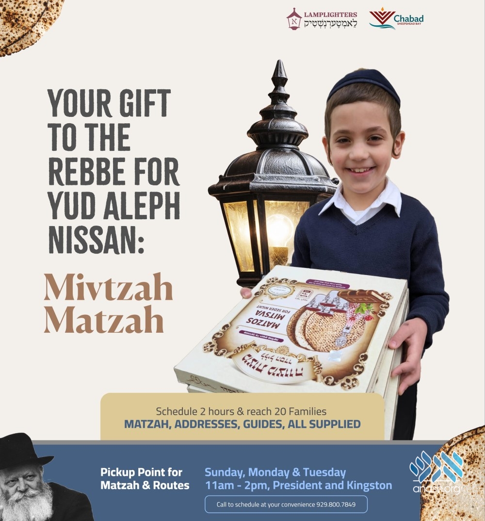 Everyone is invited to contribute to this meaningful project and make this Yud Alef Nissan even more special by helping to distribute Matzah to Jewish families in Brooklyn.