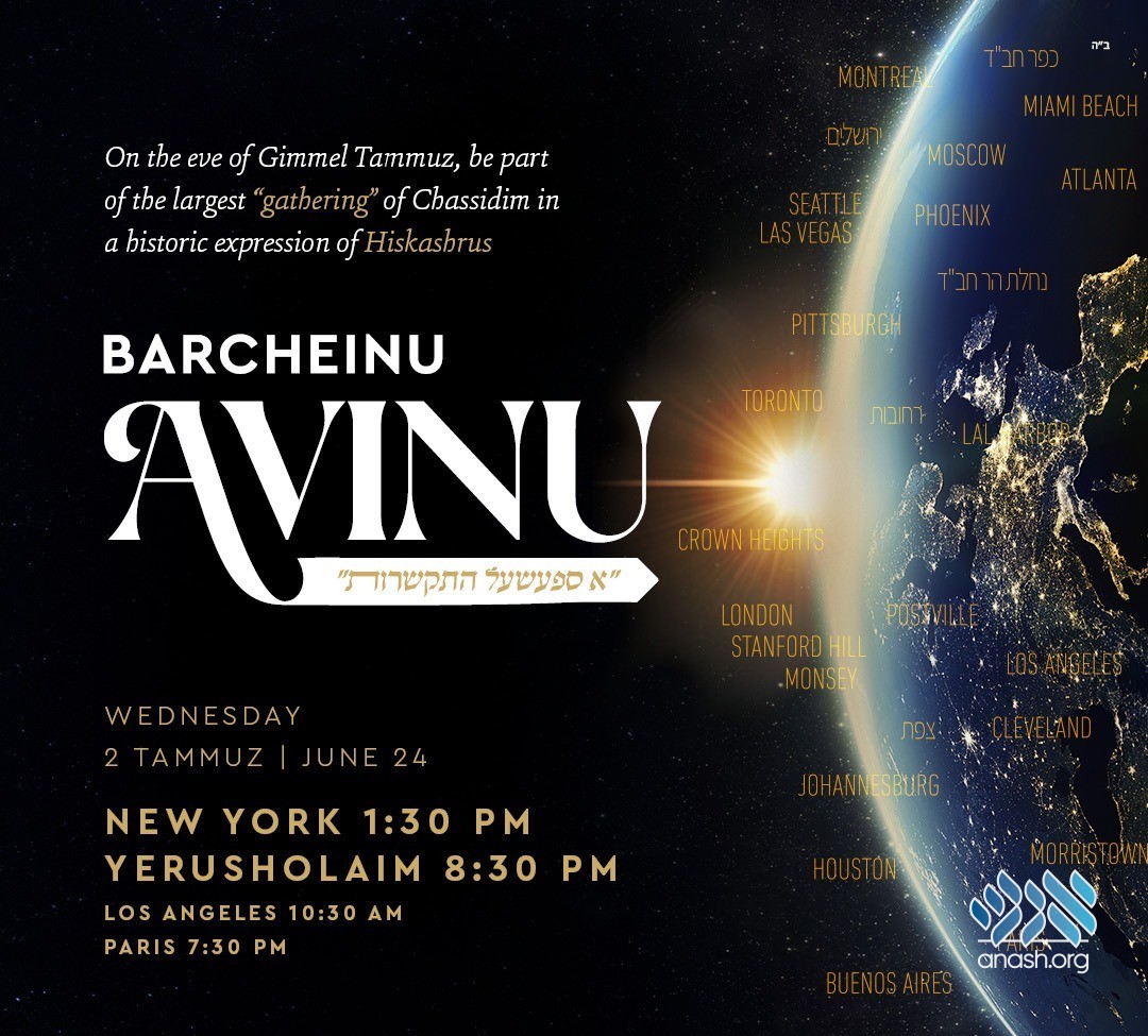 “Barcheinu Avinu – a special hiskashrus” will be held on Wednesday, Erev Gimmel Tammuz – June 24, at 1:30 PM EST, 10:30 AM in Los Angeles, 6:00 PM in London, 7:30 in Paris, 8:30 PM in Moscow and Israel.
