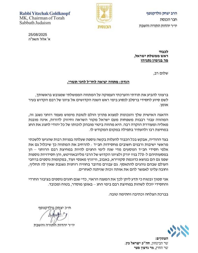 In a letter to Prime Minister Binyamin Netanyahu, MK Yitzchak Goldknopf formally requested that the government permit thousands of Lubavitch bochurim to travel to the Rebbe’s Ohel and to 770 for Tishrei, despite the current exit restrictions affecting many who are draft-eligible or have pending draft obligations.