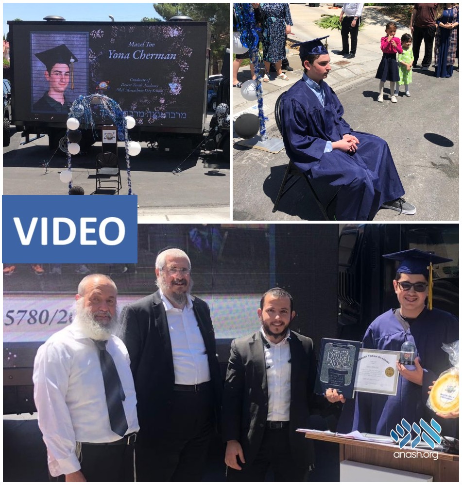 The faculty of Desert Torah Academy of Las Vegas, headed by shluchim Rabbi Shea and Dina Harlig, began looking into the different options a few weeks ago. Having heard of drive-by graduations happening in New York, they decided to try it in Vegas as all.