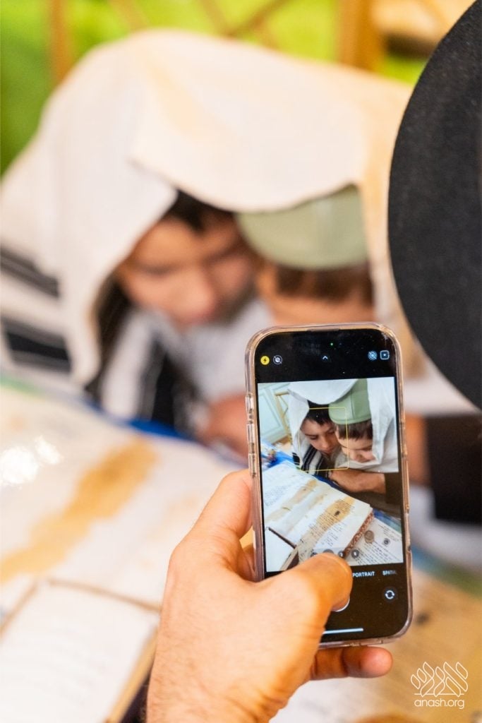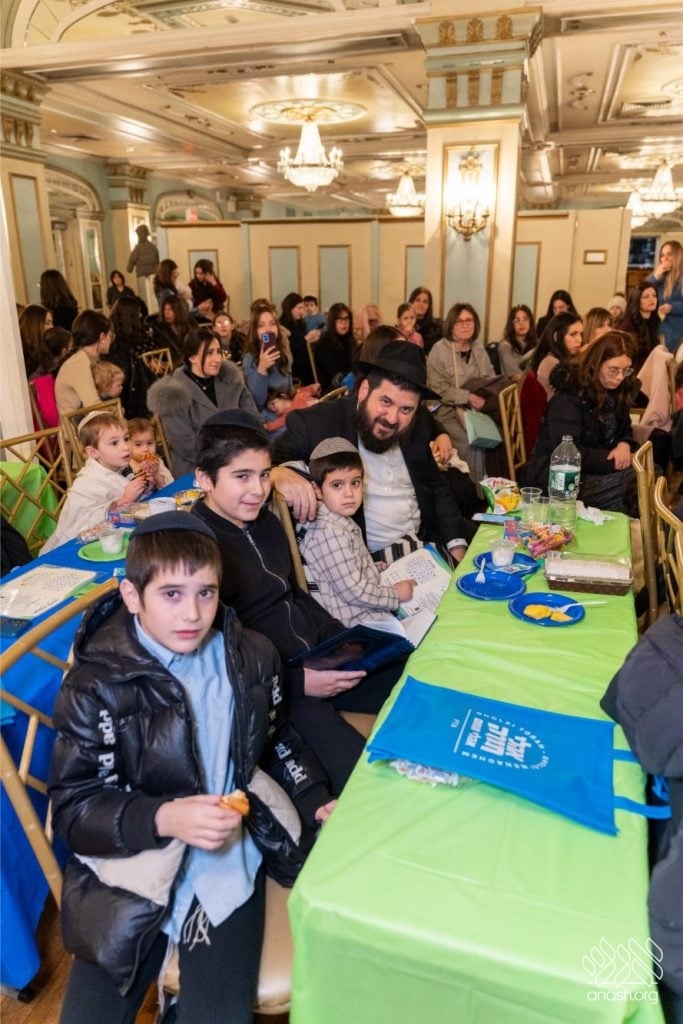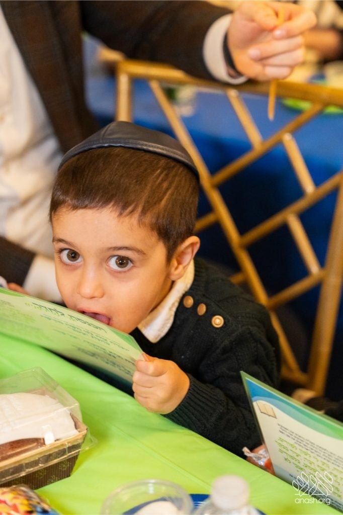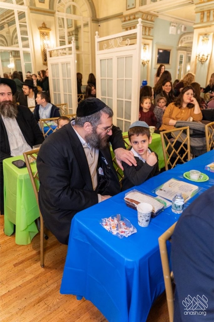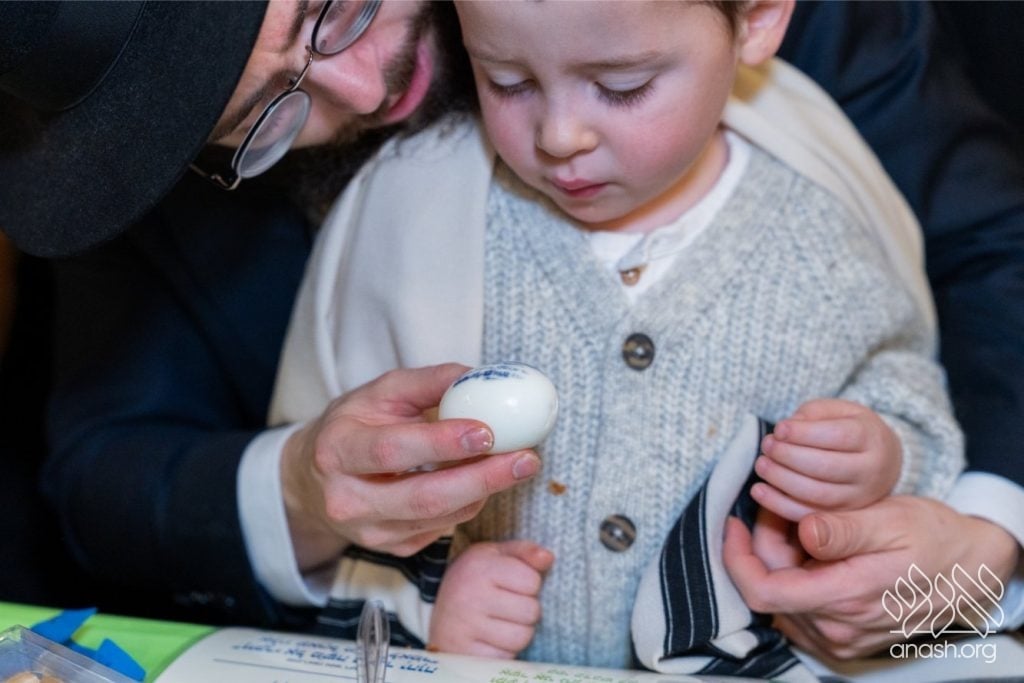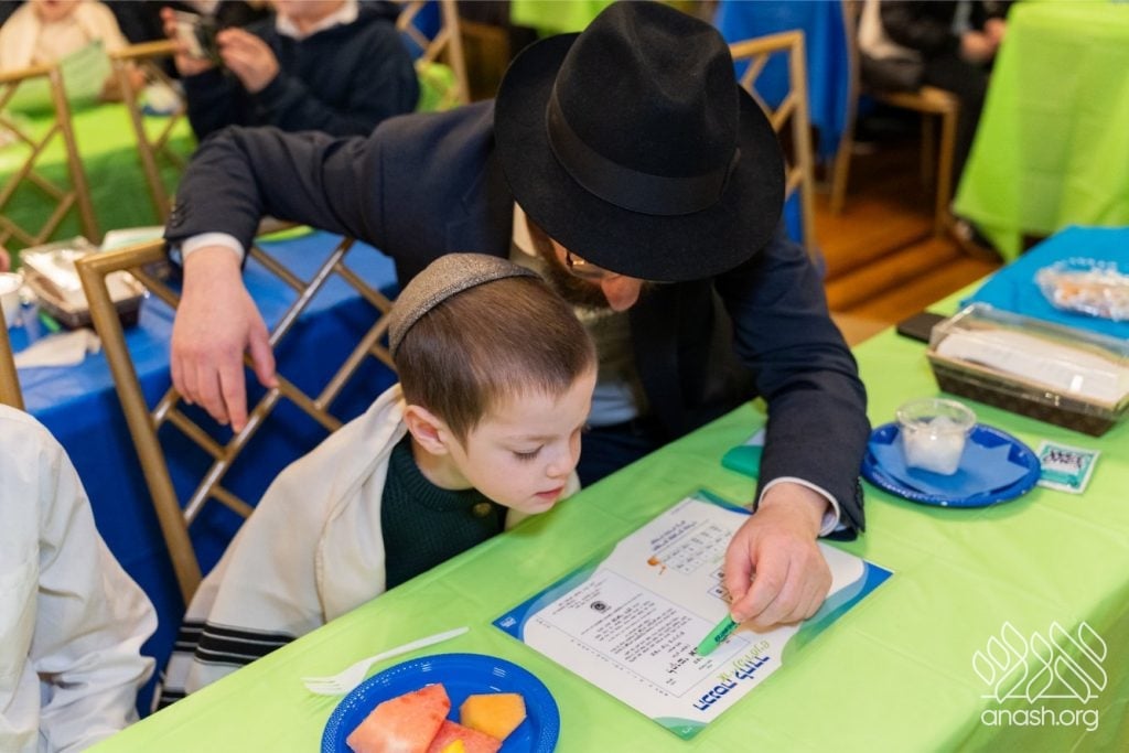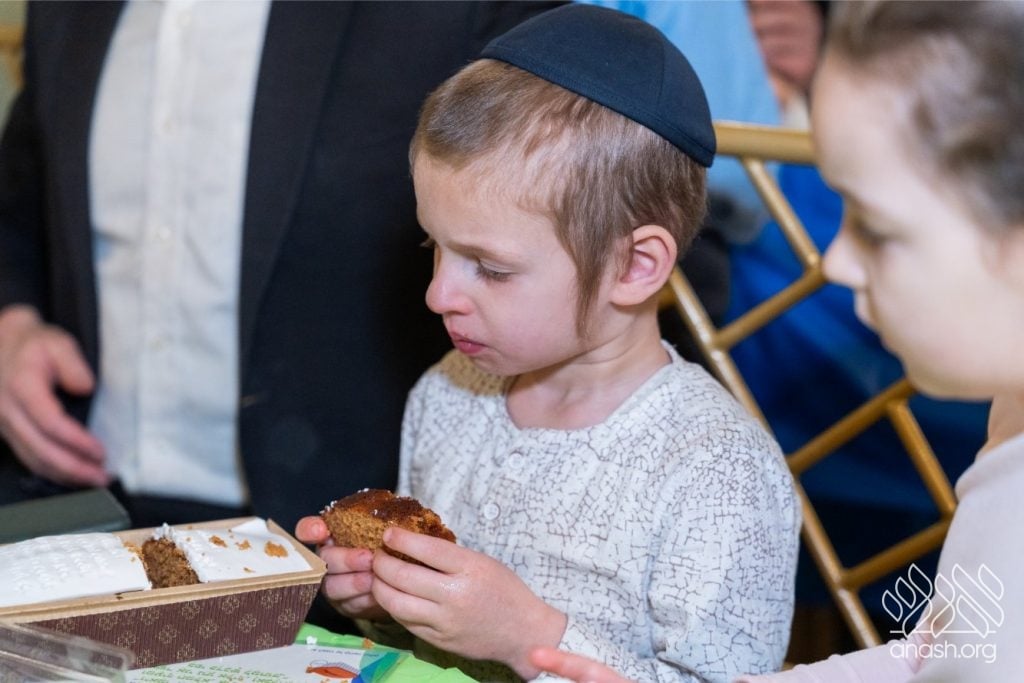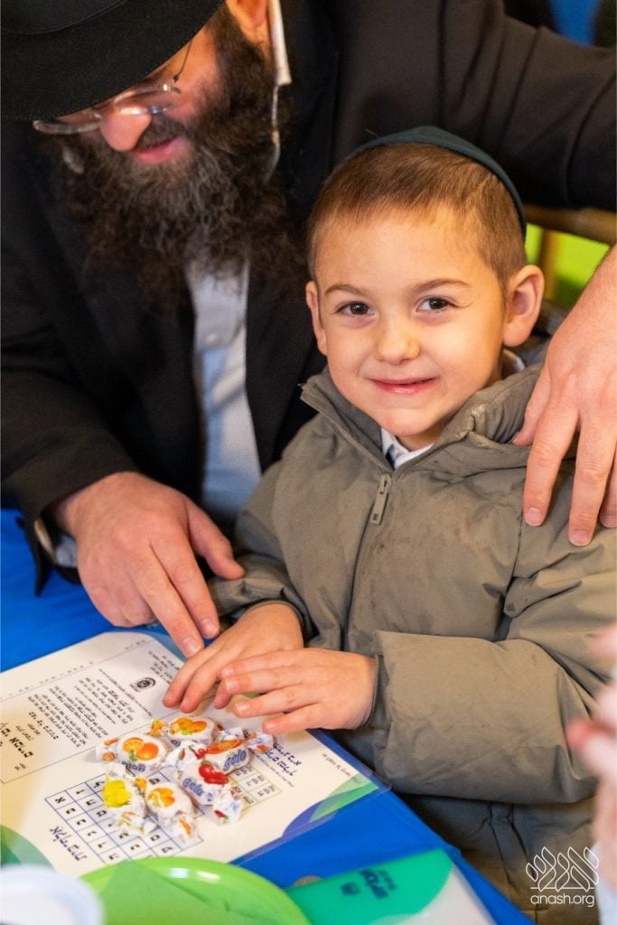Families arrived to a festive atmosphere filled with balloons and music, setting an immediate tone of excitement and love for Torah. Each family was greeted with their own thoughtfully prepared table, complete with everything needed for the araynfirnish experience. Honey cake, an egg, honey, an Aleph Beis chart, and special pekalach were prepared in advance, along with an Aleph Beis puzzle and a customized magnet to take home, allowing parents and children to be fully present for this meaningful moment.