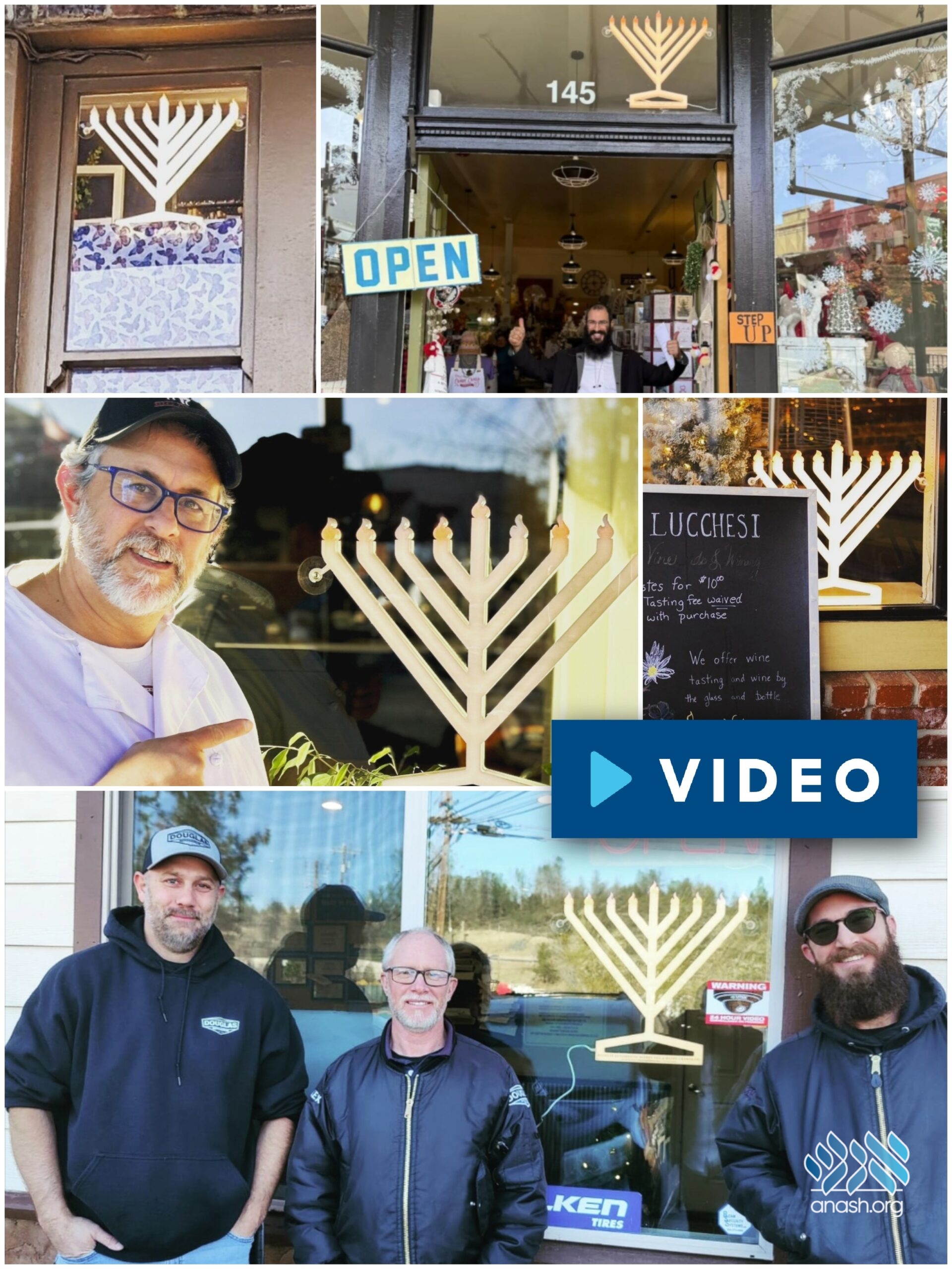 Shluchim in downtown Grass Valley, CA, have taken Pirsumei Nissa to new heights, with a ‘Merchant Menorah’ initiative, joining up with dozens of local stores to display bright menorahs in their storefronts and uplift the Jewish community.