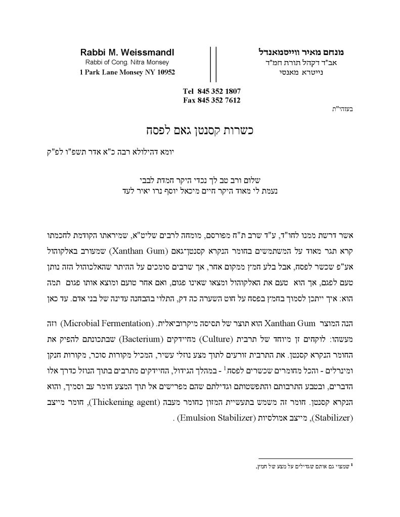 Rabbi Weissmandel issued a lengthy responsa dated 21 Adar 5786 defending the permissibility of xanthan gum on multiple halachic grounds.