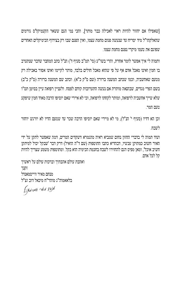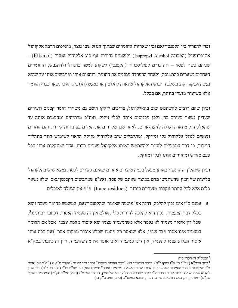 A senior OU mashgiach also sent a detailed letter – signing his name but requesting that it not be published – arguing that xanthan gum constitutes less than 0.08% of any final food product, “batel many times over in sixty,” and that the alcohol used “is pagum in taste and does not transfer any absorbed taste into food according to halacha.” He added that calling products with xanthan gum forbidden to keep in the house over Pesach “is not acting as a stringent person – it is distorting Torah law.”