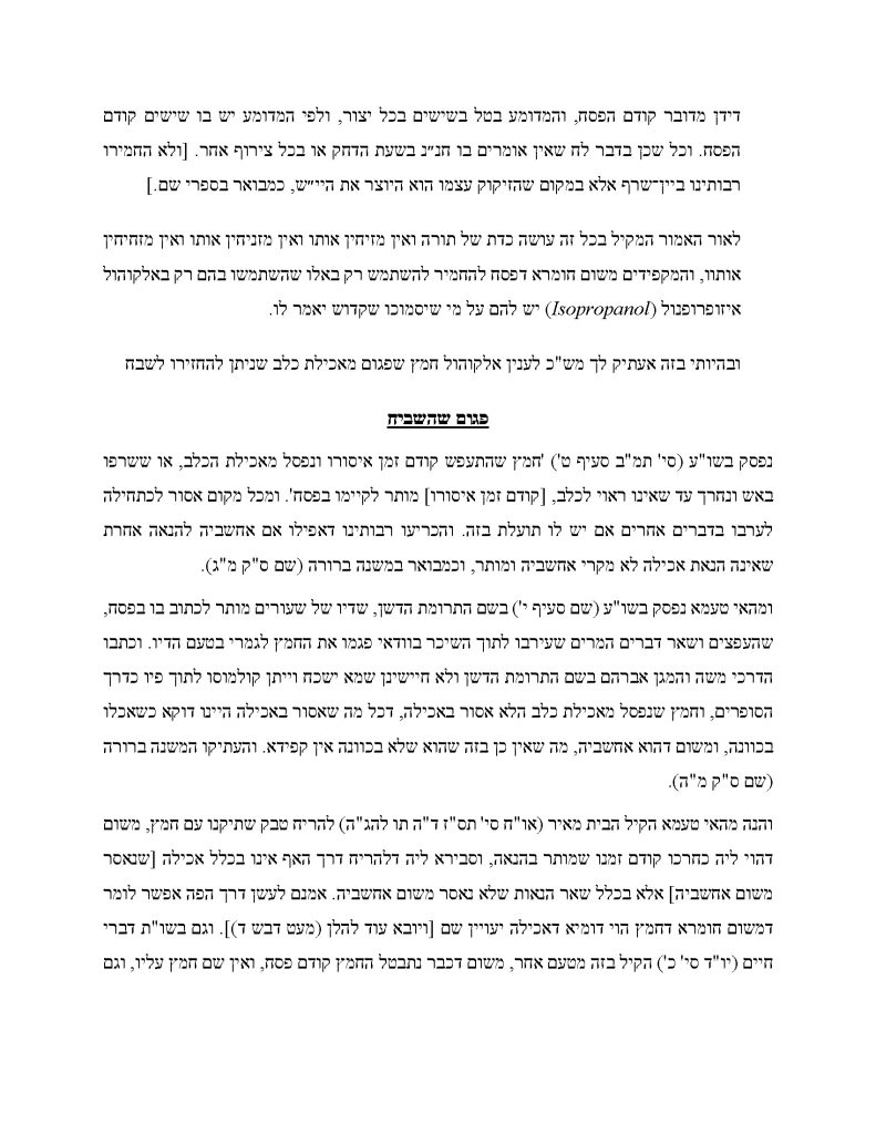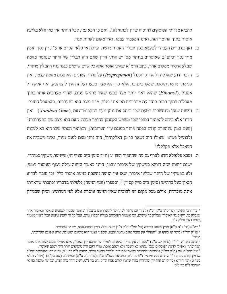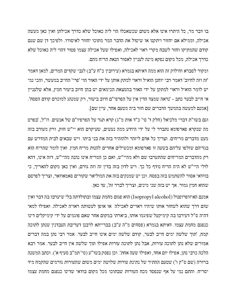 On the pagum question, he rules that isopropyl alcohol “is inherently pagum – its off-putting character stems from its own nature, not from any added ingredient.” His conclusion: “One who is lenient acts in full accordance with halacha and need not be moved or troubled.”