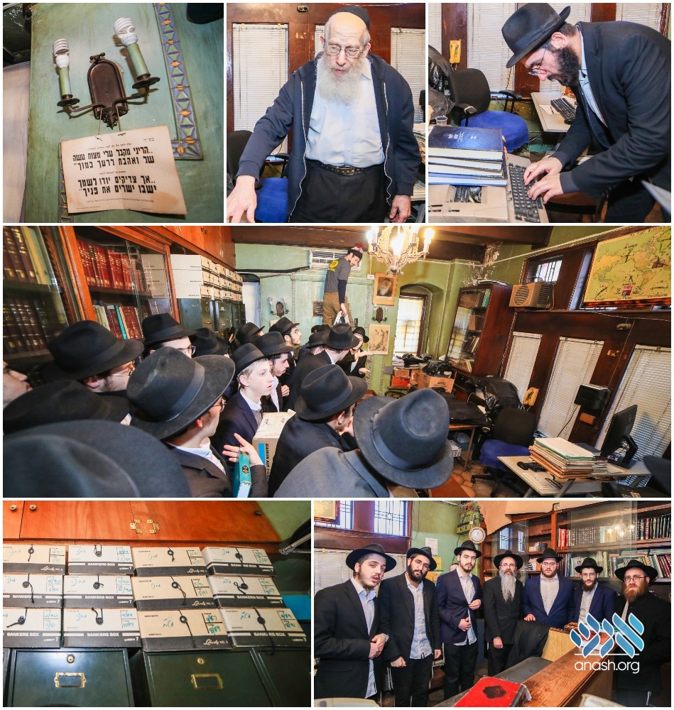 A group of bochurim from the Chabad Yeshiva in Bnei Brak on a visit to New York were given a rare tour of the ‘cheder hamazkirus’ in 770, the room where the Rebbe’s secretariat worked out of.