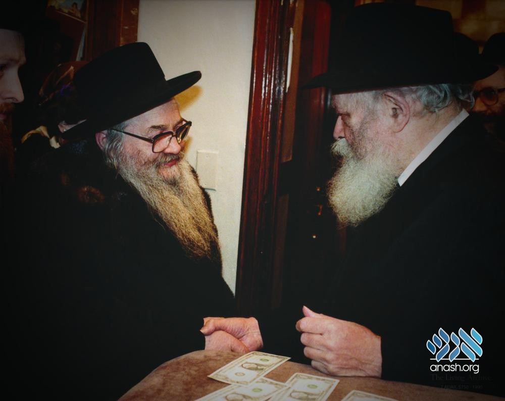 On 7 Adar 5750, Harav Schneebalg along with his wife and son came to the Rebbe for Sunday dollars. Rabbi Leibel Groner introduced him to the Rebbe and mentioned his tremendous support of Chabad in Manchester. The Rebbe gave him an additional dollar and wished him “yaarich yomim al mamlachto“, that he merit many long years in his kingdom.